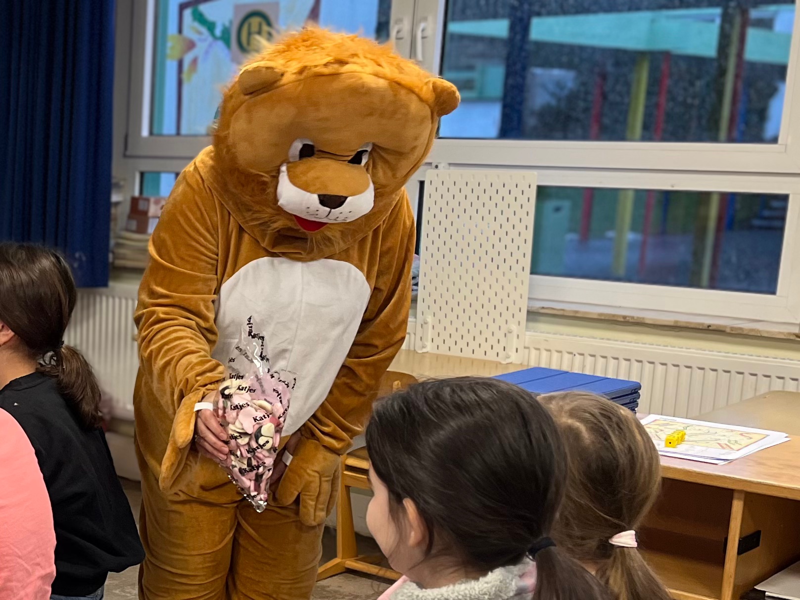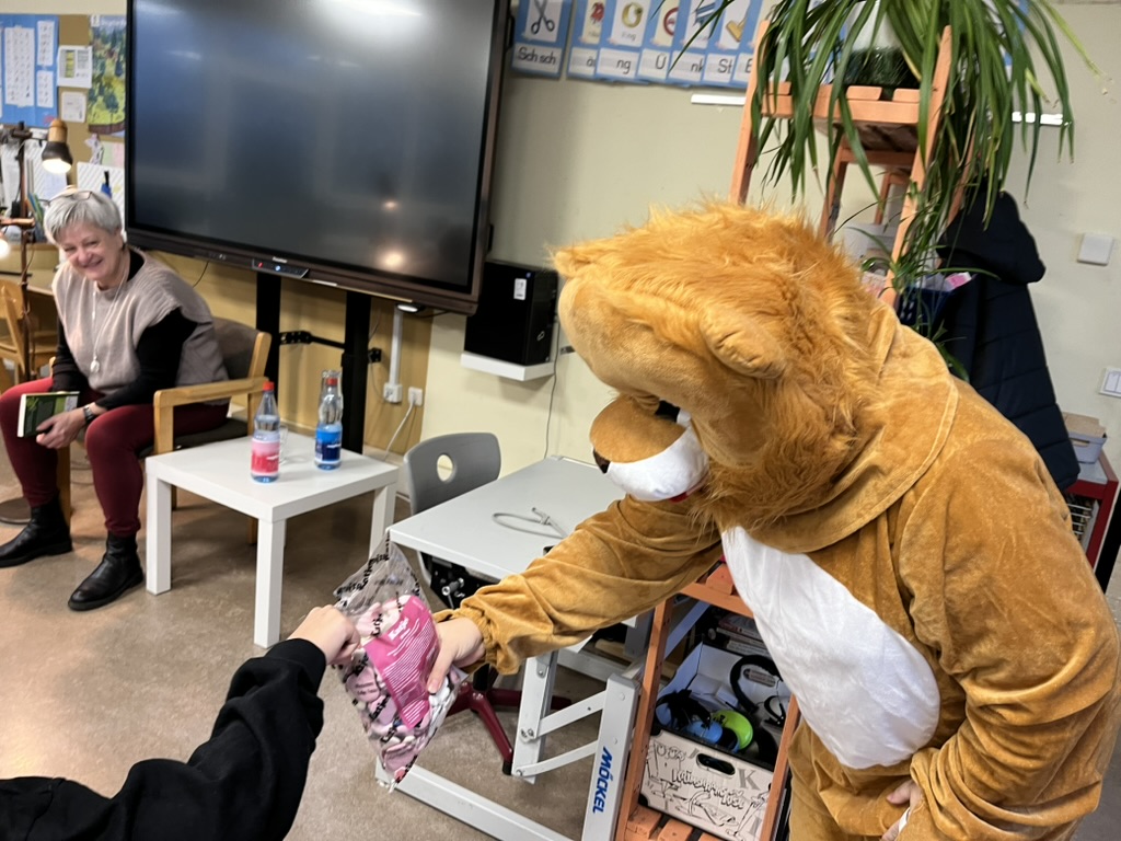 In der zweiten Schulstunde versammelten sich die Kinder, um Frau Caspar zuzuhören, die passend zum Anlass von Frau Demnig im Löwenkostüm begleitet wurde. Gelesen wurden die ersten beiden Kapitel aus dem Auftaktband der Reihe „Die grünen Piraten“ von Andrea Possberg und Corinna Böckmann. Im ersten Fall der Grünen Piraten dreht sich alles um das Thema Müll, Recycling, Nachhaltigkeit & Co.