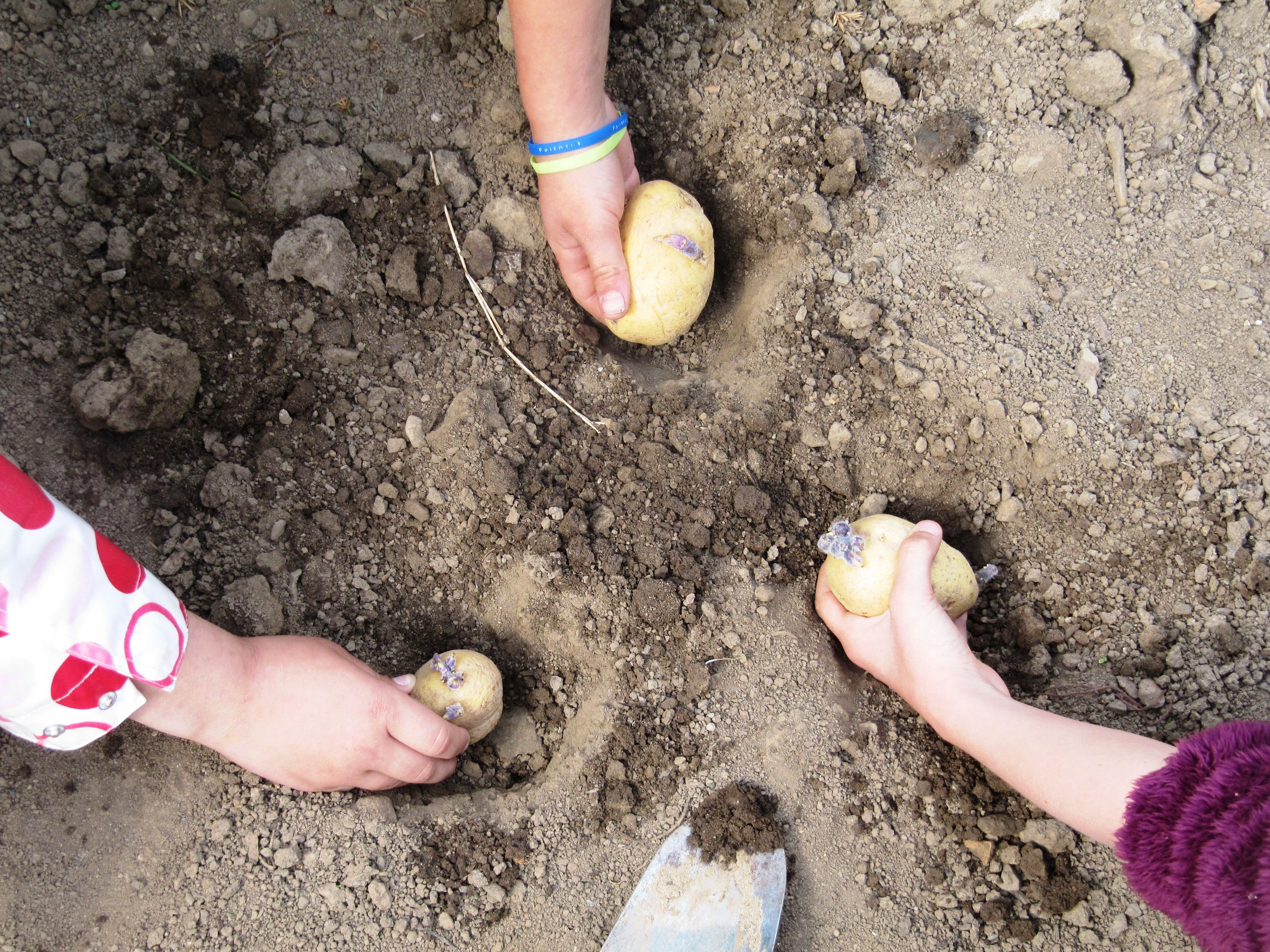 Dort steckten wir unter Anleitung eines Großvaters Kartoffeln in die Erde. Wichtig war, dass das „Auge“ (ein Trieb) nach oben