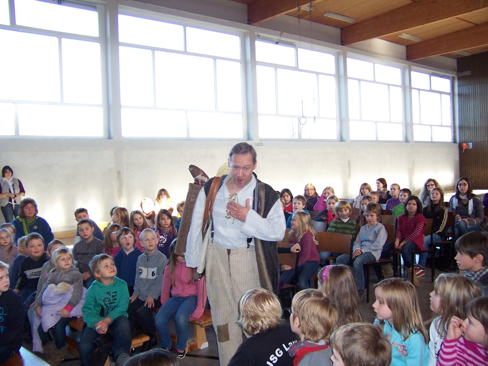 Am 23.11.2011 gastierte die österreichische Kinderoper „Papageno“ an unserer Schule. Alle Klassen und die Kinder der Kindertagesstätten Maar und Wallenrod waren in der Turnhalle versammelt, um die Märchenoper „Hänsel und Gretel“ anzuhören. Auch manche Eltern und Großeltern waren gekommen.