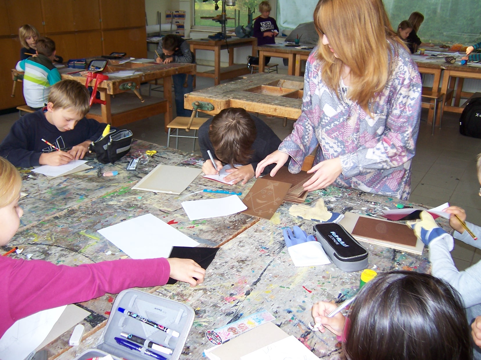 Wer Lust auf kreatives Arbeiten hatte, konnte im Werkraum verschiedene Drucktechniken ausprobieren. Erstaunlich gut wurde auch dies von unseren großen und kleinen Gästen angenommen. Im Musikraum präsentierten die Kinder originelle Instrumente, die sie aus verschiedenen Materialien hergestellt hatten. Hier konnte man mit großem Erstaunen sehen, womit man alles Klänge erzeugen kann! Auch über den Tag, den die Gruppe bei der Instrumentenfirma Mollenhauer verbracht hatte, konnte man manches erfahren.