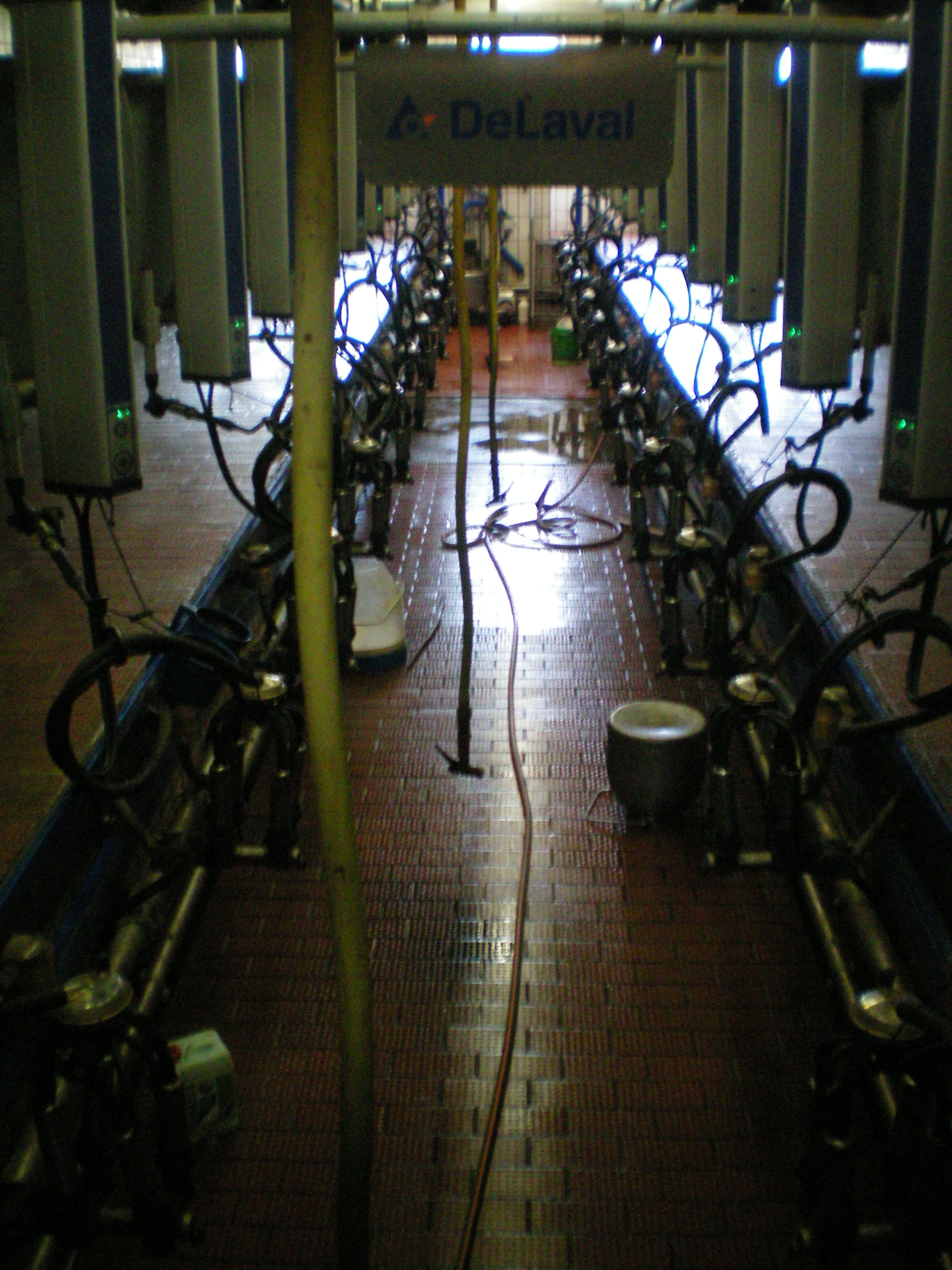 Zuerst waren wir im Melkstand. Dort passen 24 Kühe hinein, auf jeder Seite 12. Danach haben wir uns den großen Milchtank angeschaut.