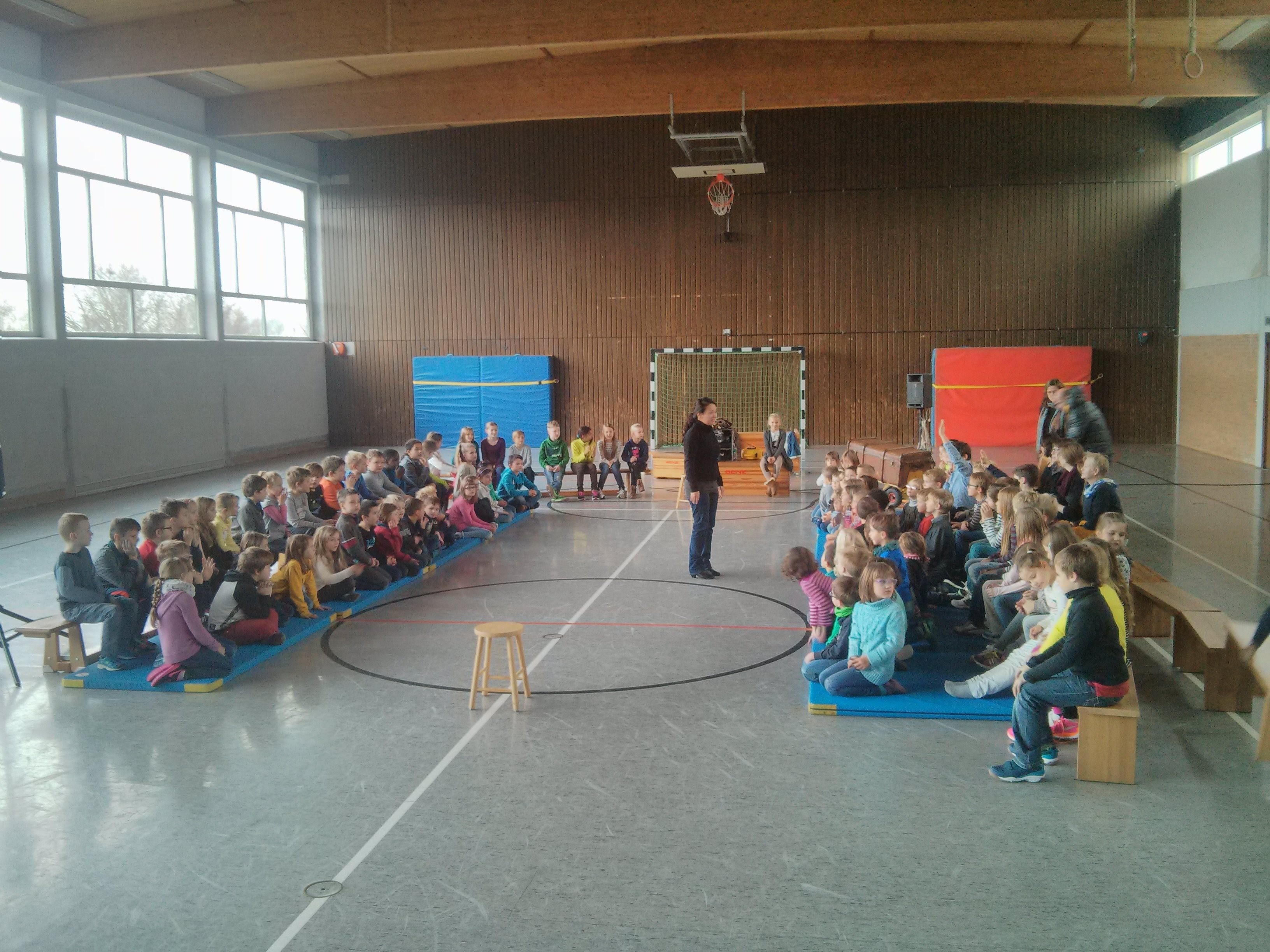 Eine heiter-stimmungsvolle Stunde verbrachten wir so in der Sporthalle unserer Schule, die uns noch lange in Erinnerung bleiben wird. Die Bilder geben einen kleinen Eindruck davon, wie es gelingen kann, Kinder zu „verzaubern“: mit einfachsten Mitteln und spärlichen Requisiten , aber mit Belebung der Phantasie, begleitet durch herrliche Musik und Gesang.