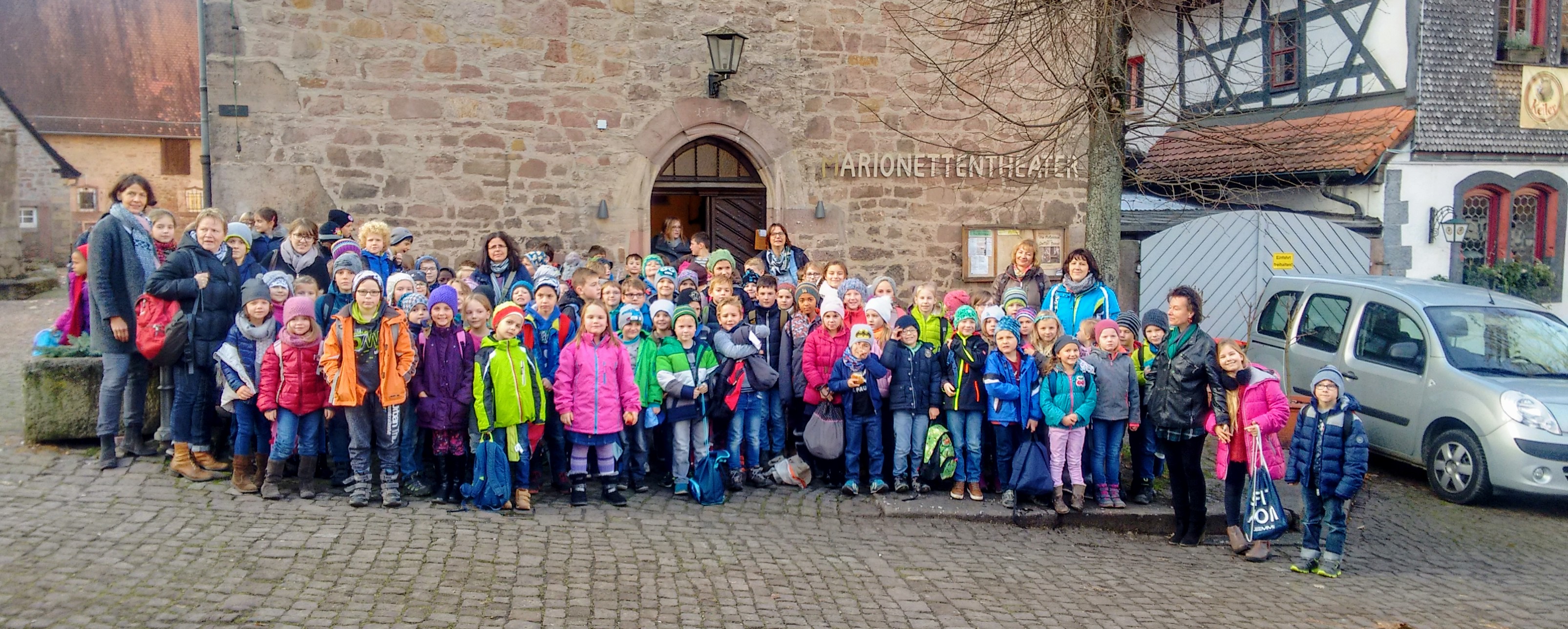 Am Donnerstag, 24.11.2016 unternahmen wir, wie jedes Jahr vor Weihnachten, mit allen Kindern der Schule eine Fahrt zum Theater. Um 8.30 Uhr brachen wir mit drei Bussen auf. Unser Ziel war das Marionettentheater in Steinau an der Straße. Auf dem Spielplan stand für uns das Märchen „Glückskind“, auch bekannt als „Der Teufel mit den drei goldenen Haaren“. Das kleine Theater bot Platz für uns alle. Die Kinder erlebten gebannt, wie die Puppen durch Geschick und sehr gute Sprache „lebendig“ wurden. Nach der Aufführung machten wir uns fröhlich und erfüllt von dem schönen Vormittag wieder auf den Heimweg.