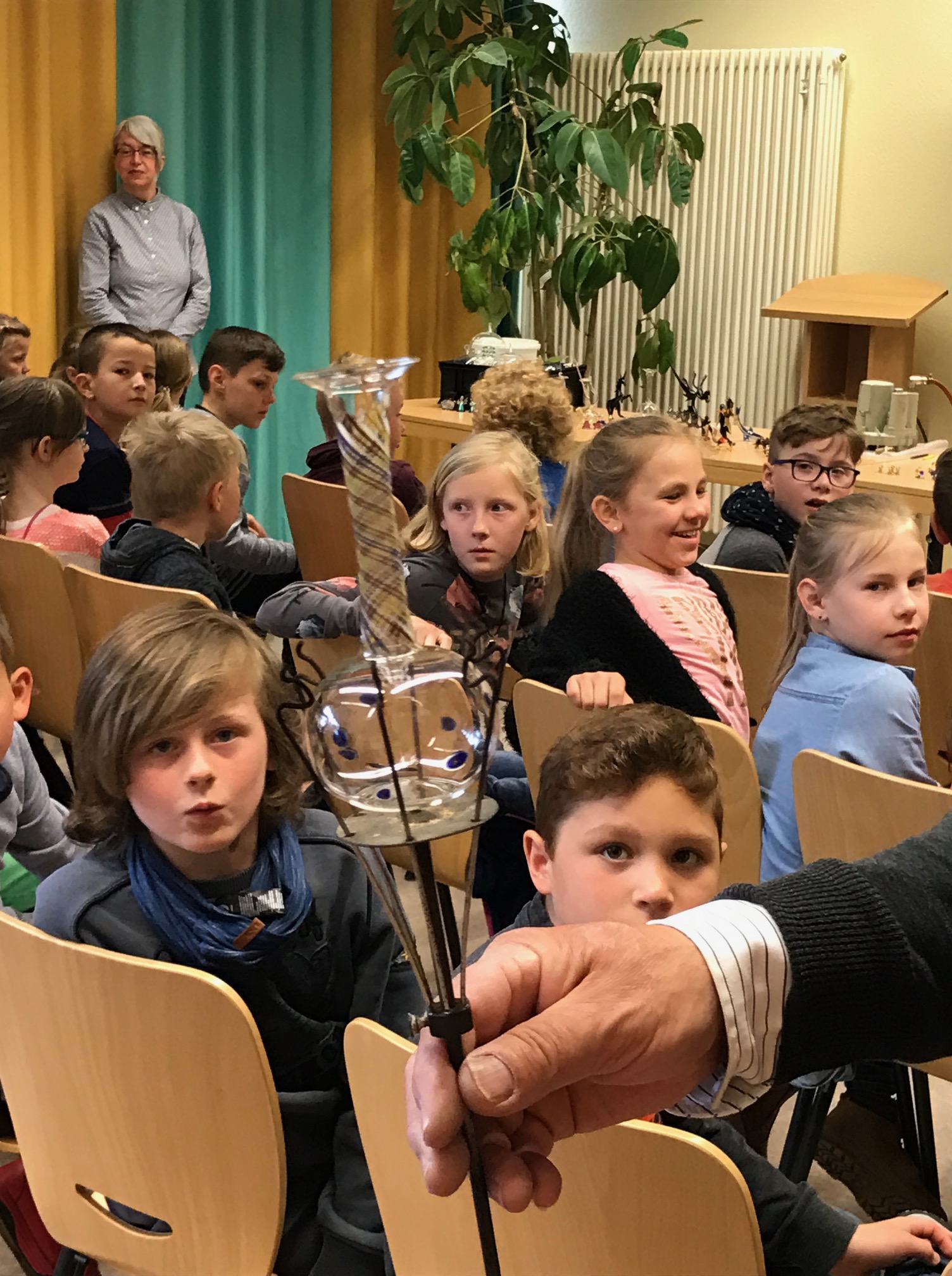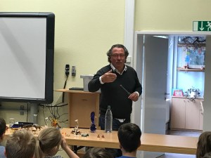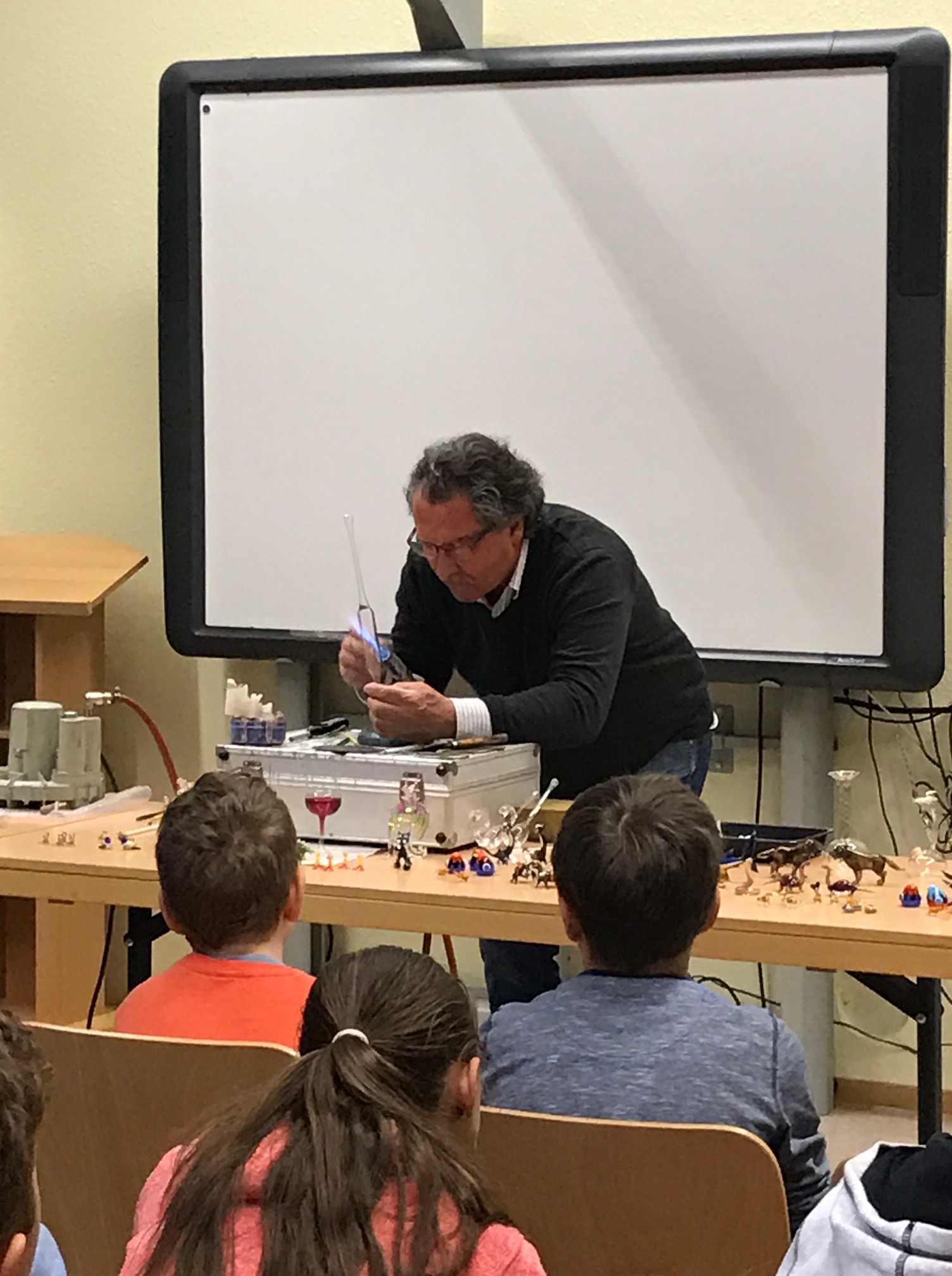 Während der ca. 45-minütigen Vorstellung erklärte das Ehepaar Sommer alles Wissenswerte, rund um das Thema Glasblasen. So erfuhren die Schülerinnen und Schüler beispielsweise, dass Glas aus Quarzsand hergestellt / geschmolzen wird. Das farblose Glas wird bei ca. 1.000°C verarbeitet, wobei der Glasbläser keine Handschuhe zum Schutz trägt.