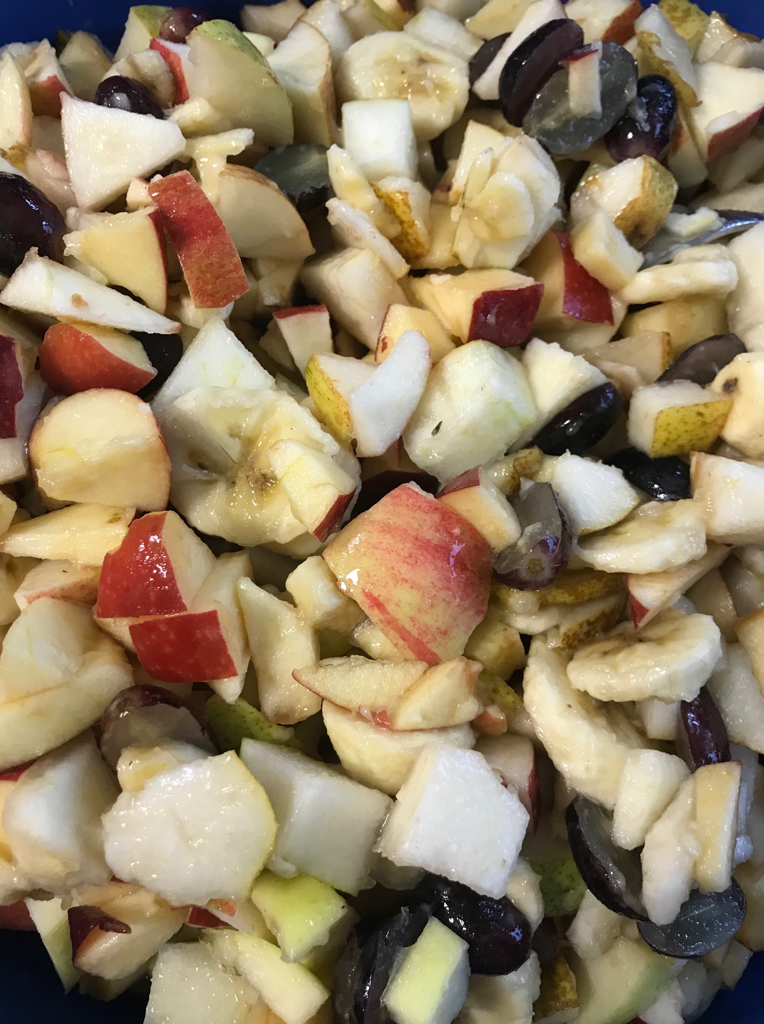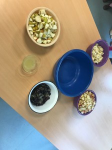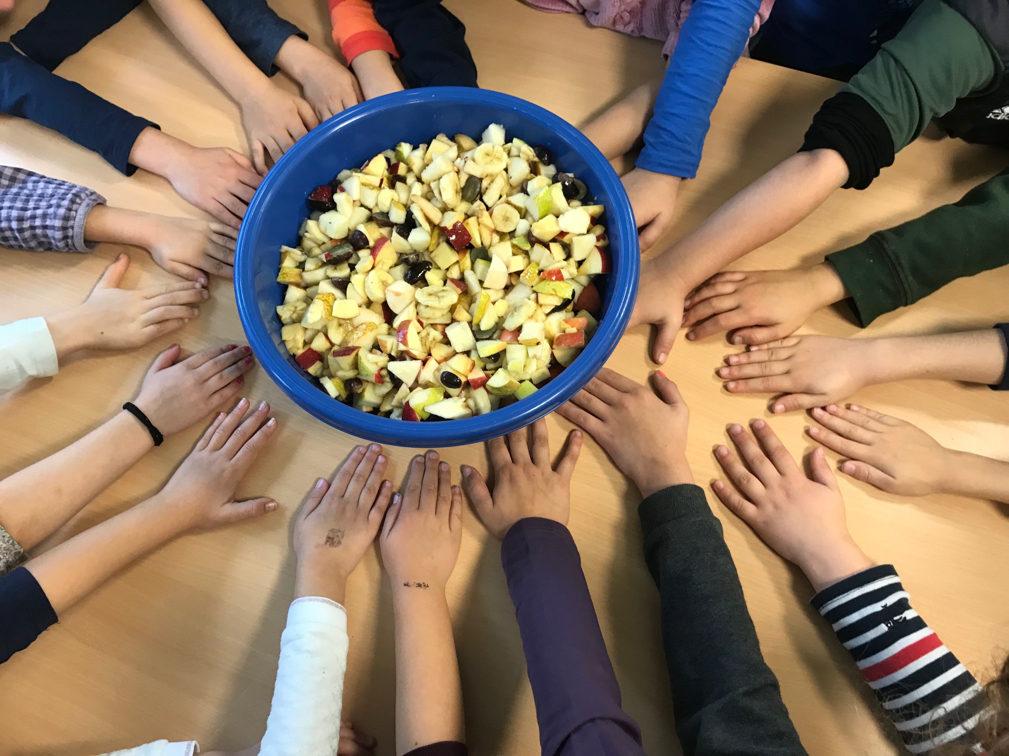 Am Donnerstag vor den Herbstferien (05.10.2017) fertigten die Erstklässler einen leckeren Obstsalat an.