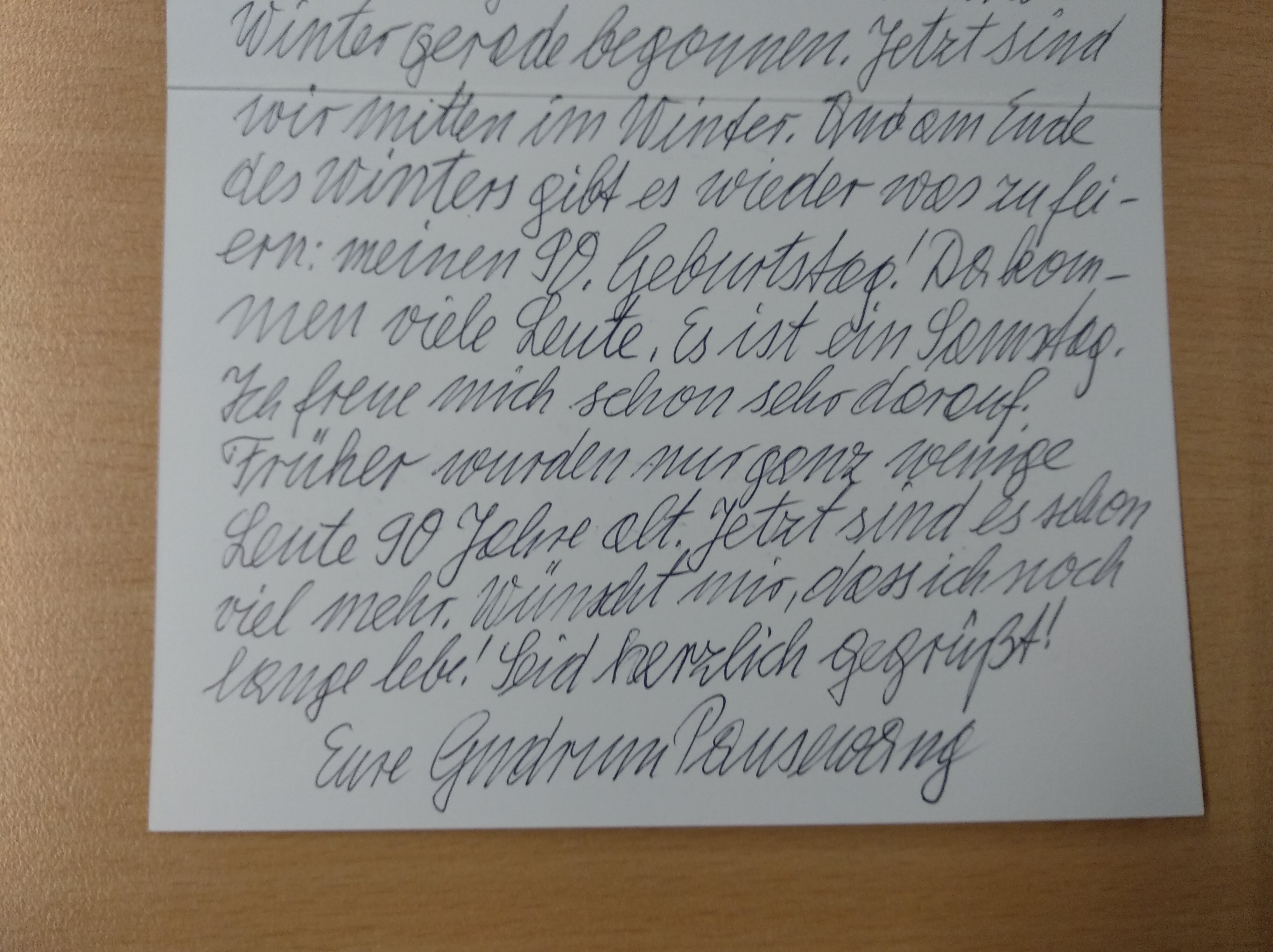 In ihrem Brief vom 29.01.2018 erinnerte uns Frau Pausewang an ihren bevorstehenden runden Geburtstag mit den Worten: „Am Ende des Winters gibt es wieder was zu feiern: meinen 90. Geburtstag! Da kommen viele Leute. Es ist ein Samstag. Ich freue mich schon sehr darauf. Früher wurden nur ganz wenige Leute 90 Jahre alt. Jetzt sind es schon viel mehr. Wünscht mir, dass ich noch lange lebe!“