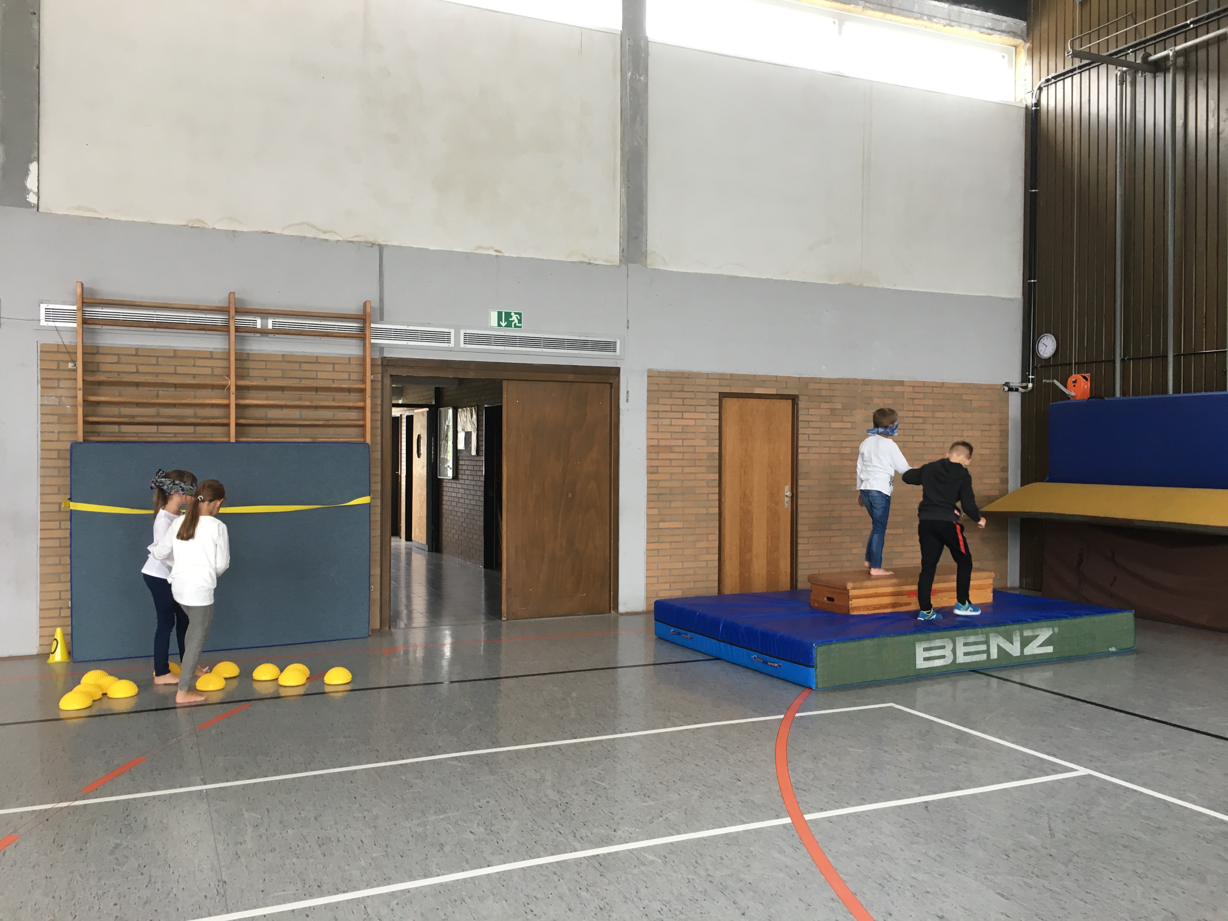 Seit dem neuen Schuljahr sind unsere Drittklässler Paten für die Erstklässler. Zum besseren Kennenlernen fand am Montag zum 3. Mal unser Vertrauensweg in der Turnhalle statt.
