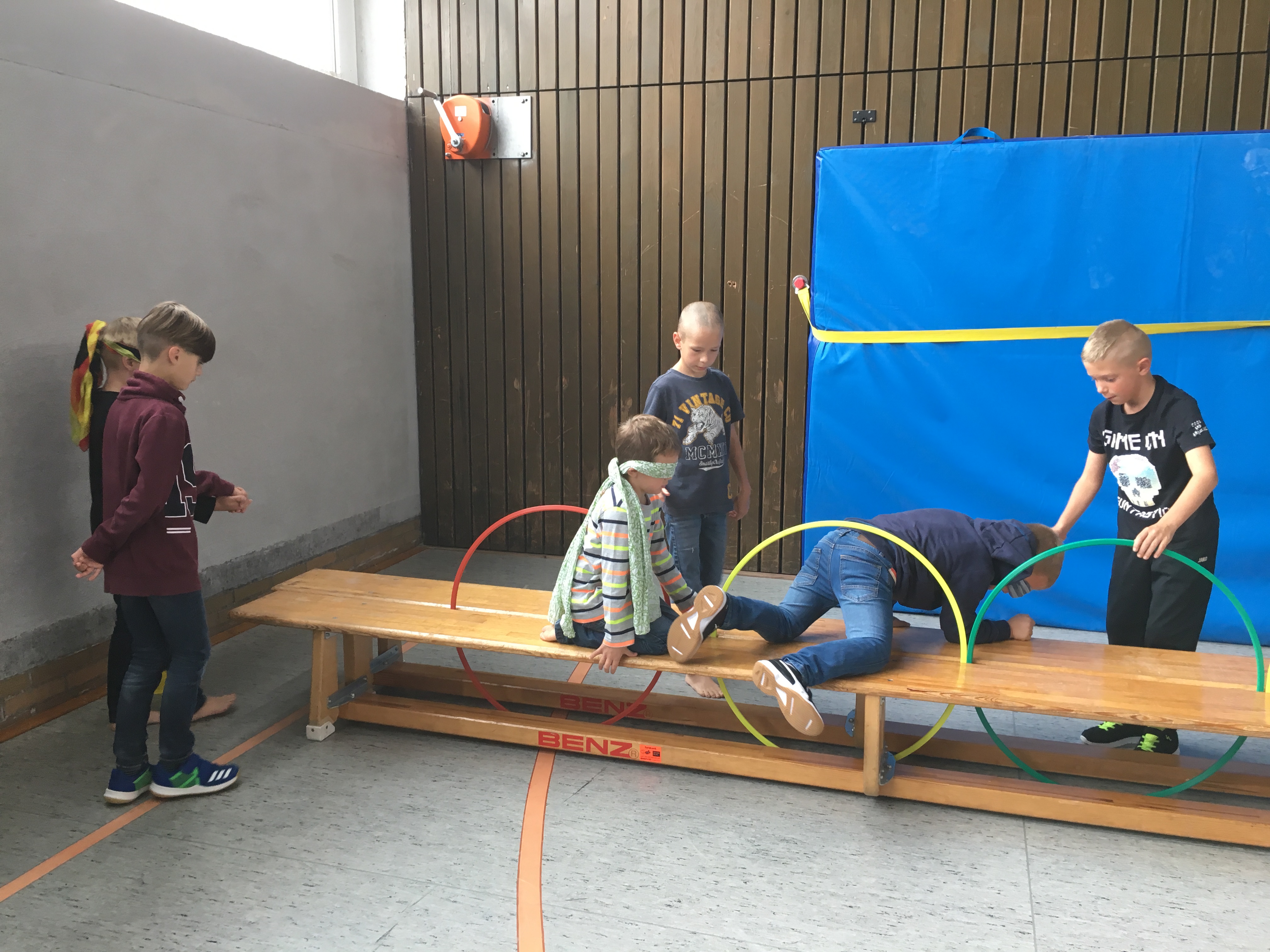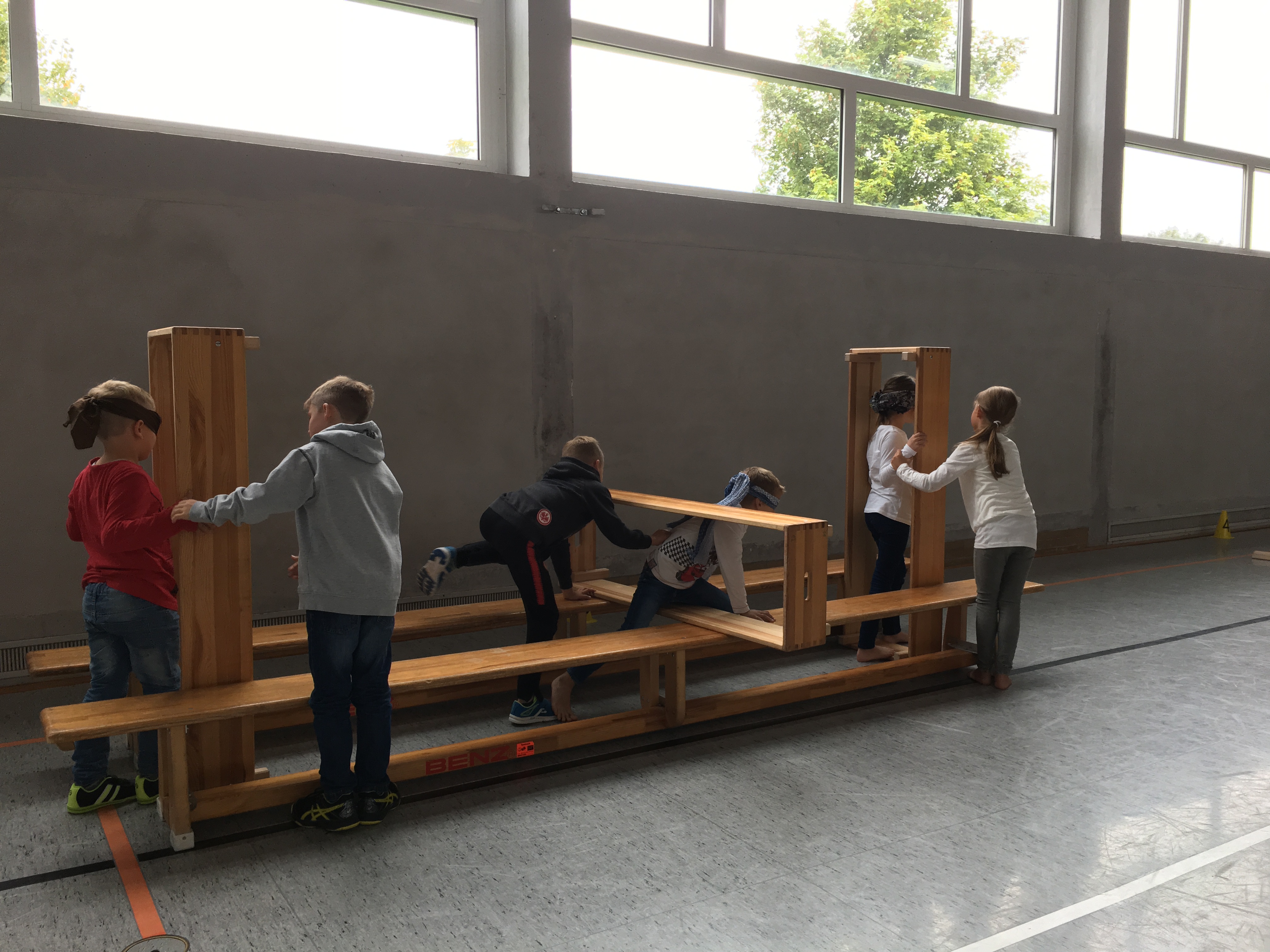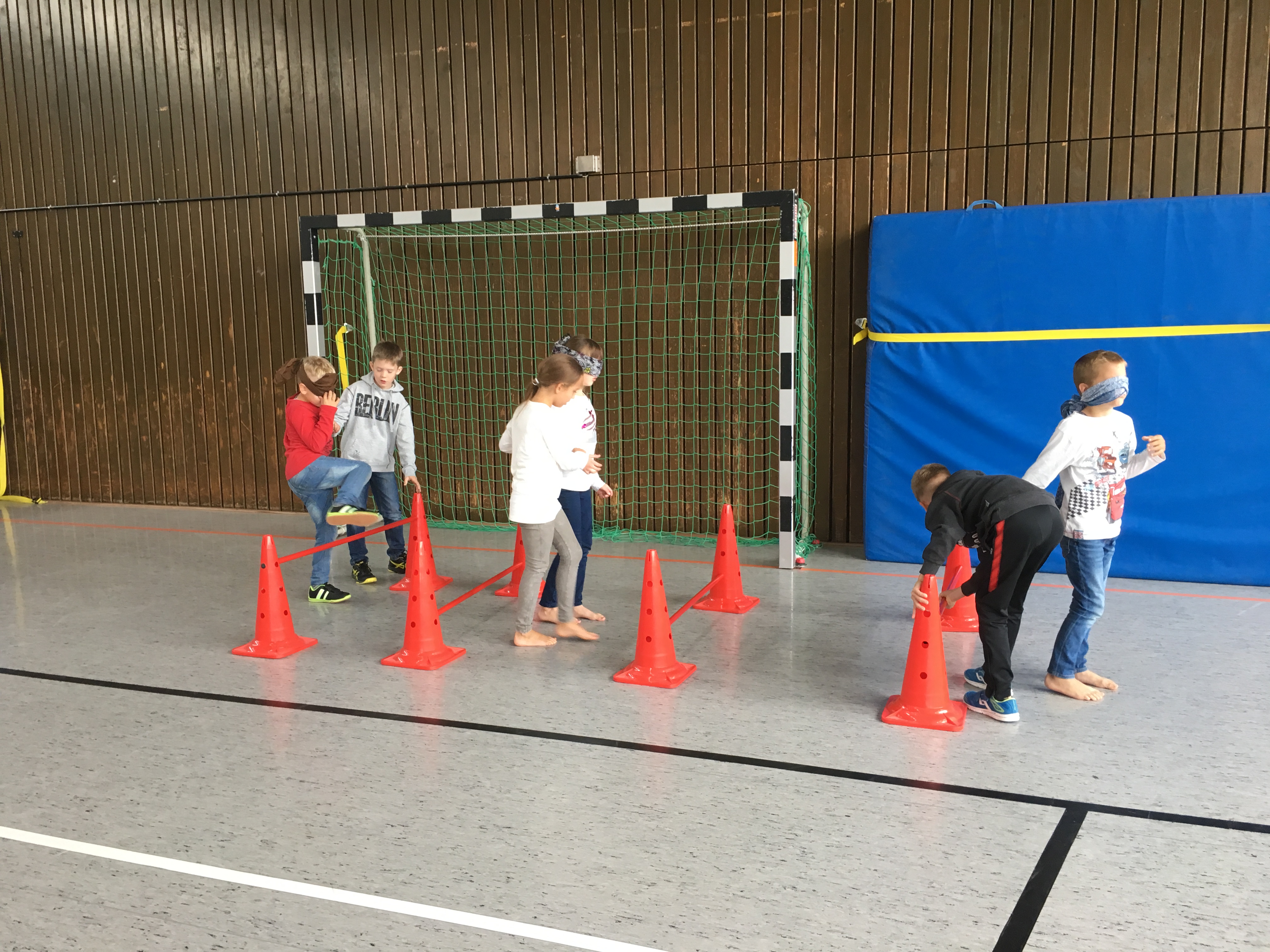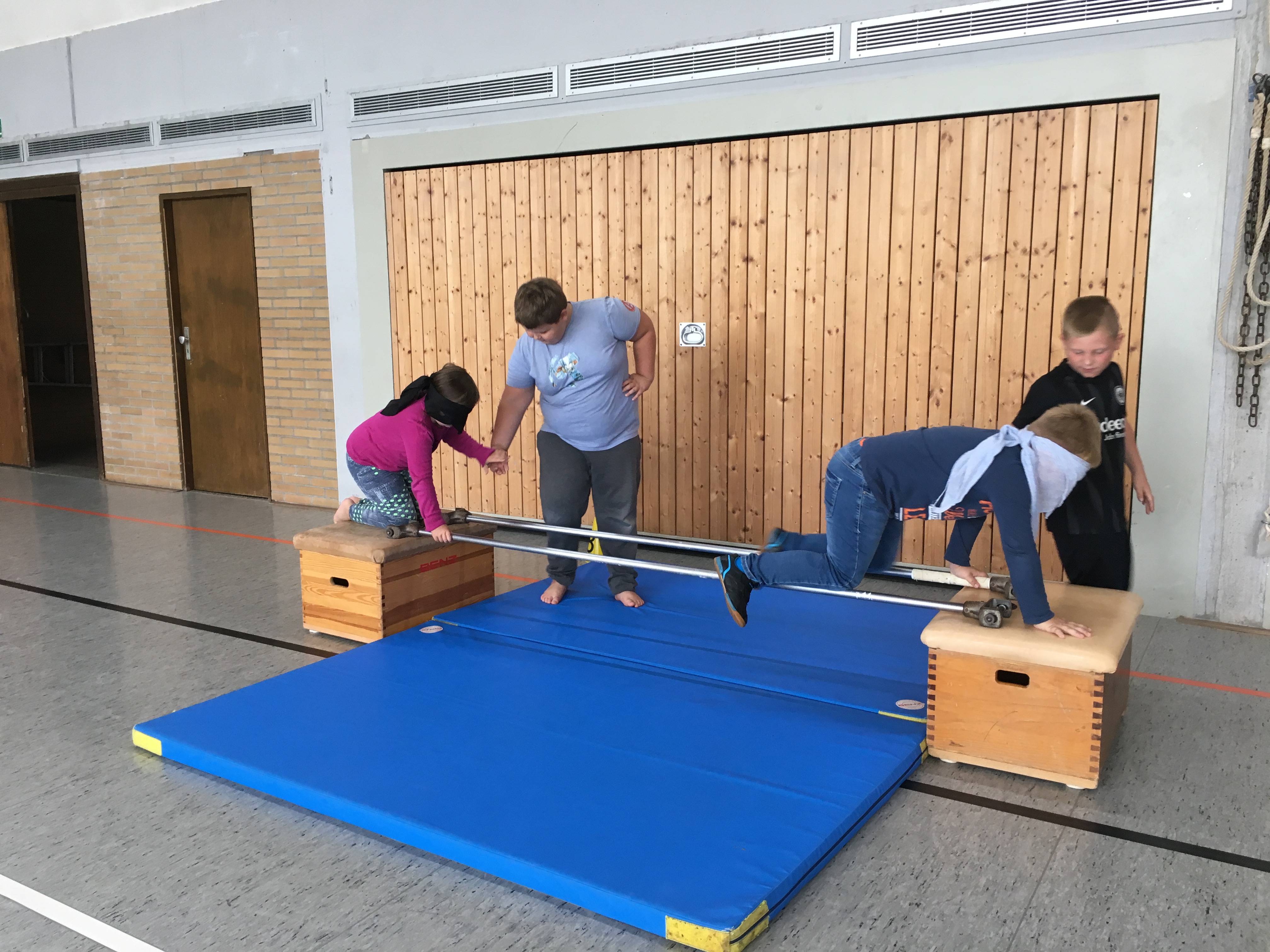 Die Patenkinder ließen sich blind von ihren Paten durch einen Parcours führen. Vertrauen musste aufgebaut werden, da manches Hindernis recht wackelig oder hoch war. Natürlich wurden auch die Rollen gewechselt und die Erstklässler führten ihre Paten.