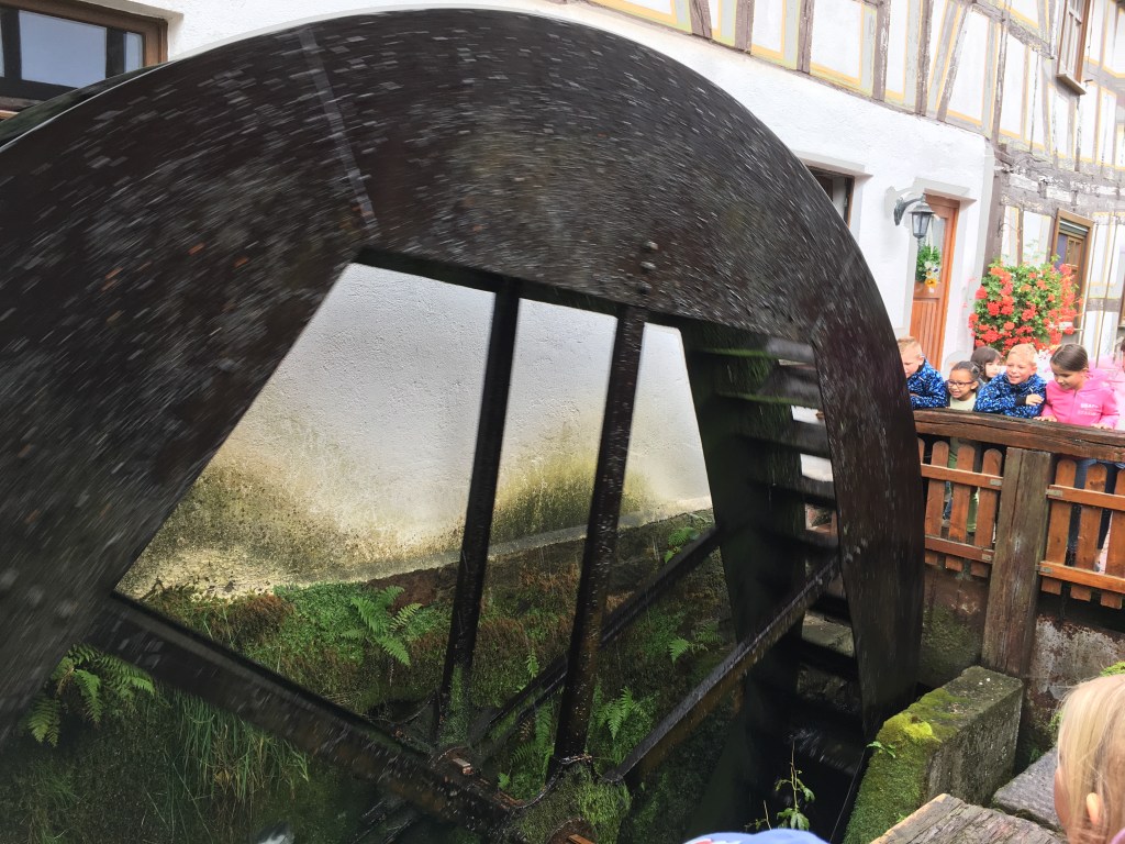 Herr Schnabel zeigte uns das große Wasserrad. Im Keller der Mühle entdeckten wir ebenfalls Räder zum zusätzlichen Antreiben des großen Rades. Immer wieder durften wir Körner und Mehl probieren.
