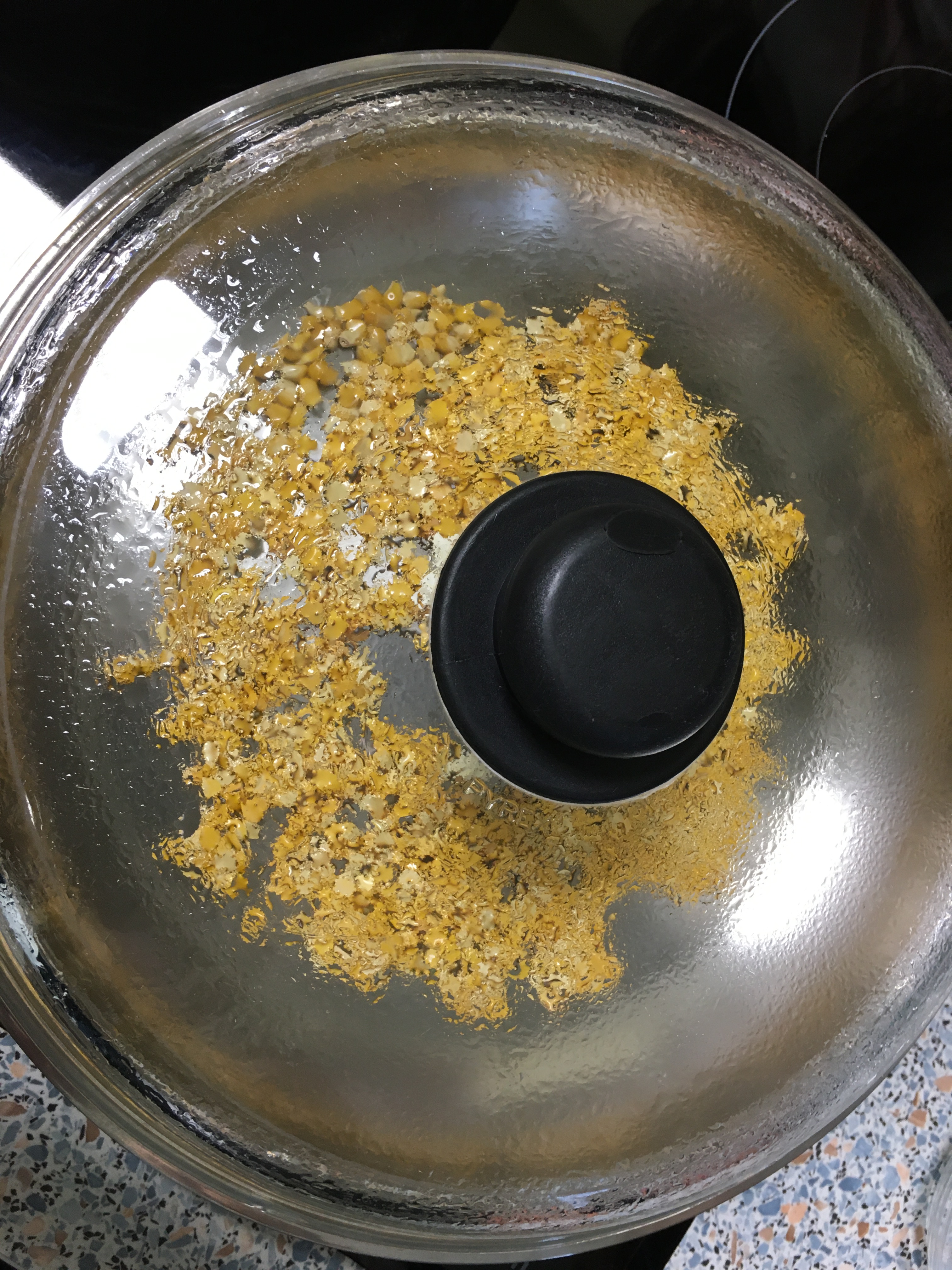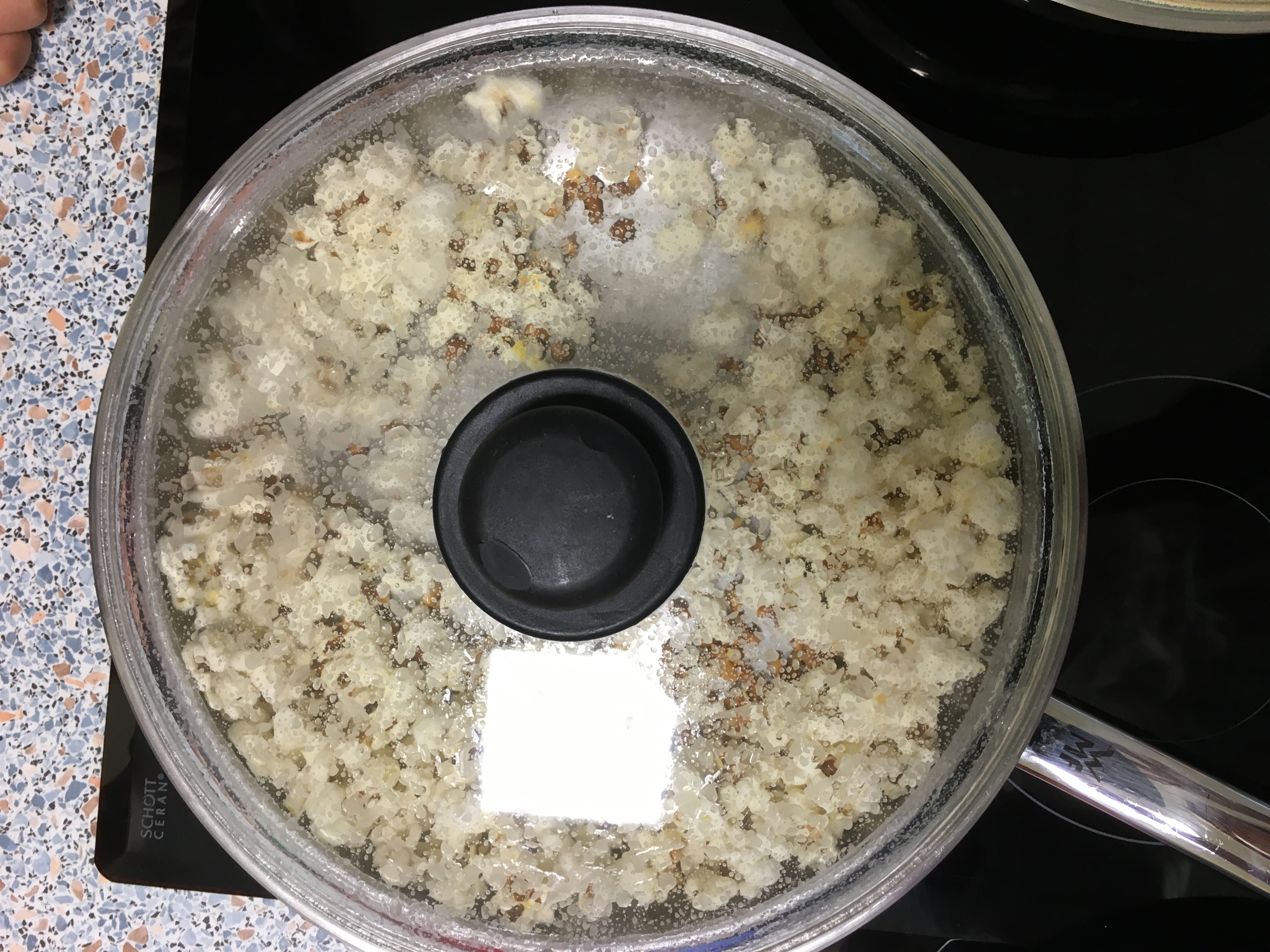Erst nachdem wir die Temperatur erhöht hatten, „potzte“ es endlich unter dem Pfannendeckel und die gelben Maiskörner verwandelten sich in luftiges Popcorn.
