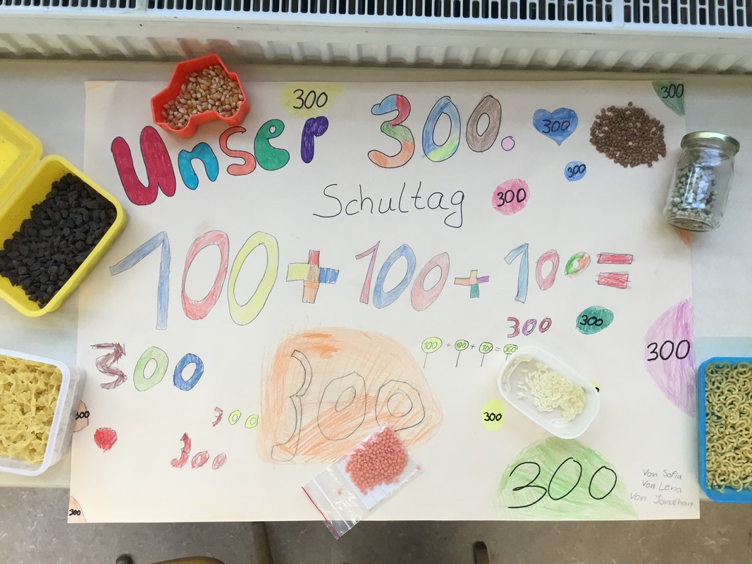 Wegen der stürmischen Sabine um einen Tag verspätet feierte die Klasse 2 ihren 300. Schultag. Die Kinder brachten 300 Dinge von zu Hause mit – mal abgezählt, mal abgewogen. Zur Feier des Tages wurden Brotgesichter gestaltet und mit Genuss verzehrt.