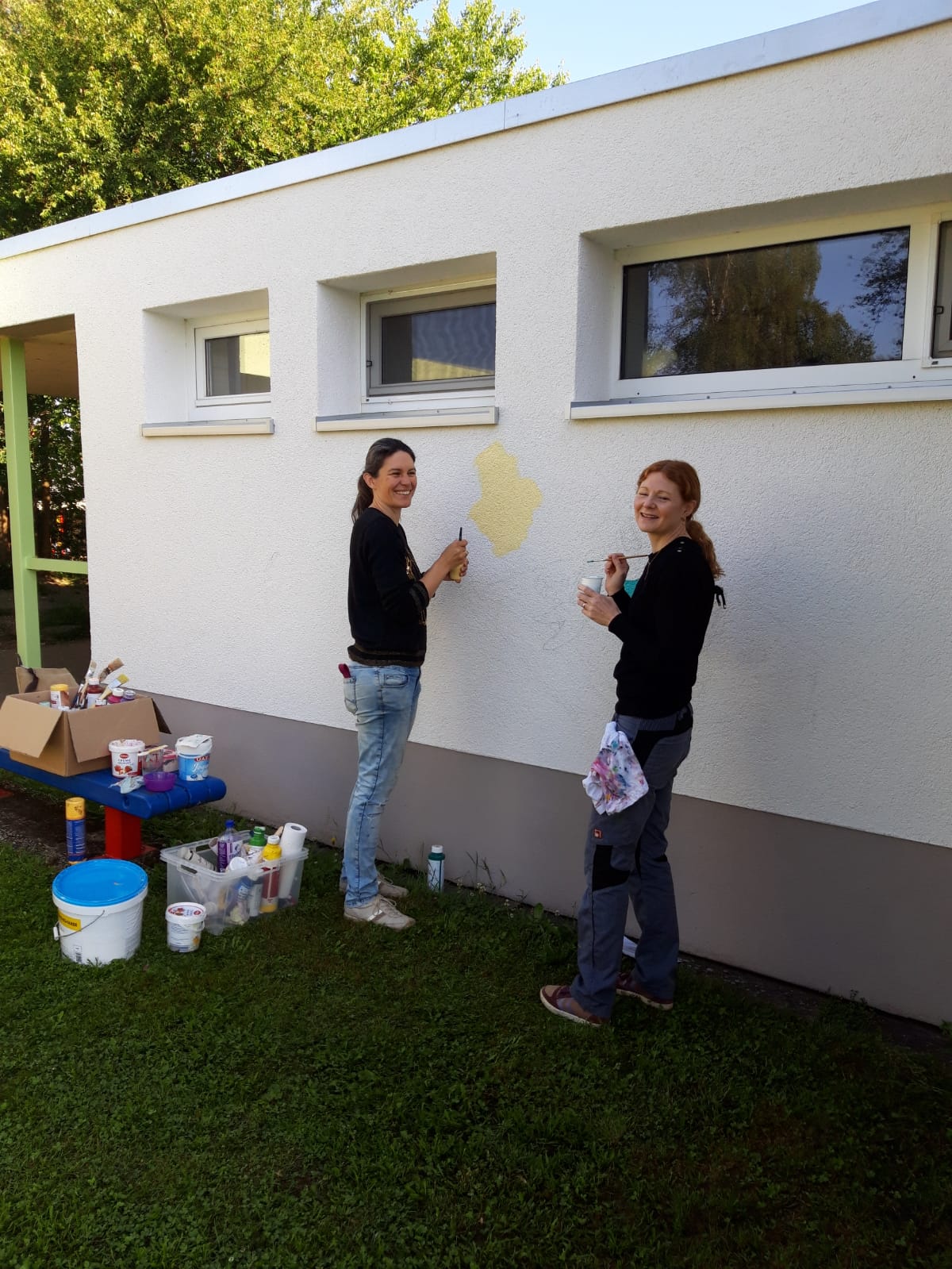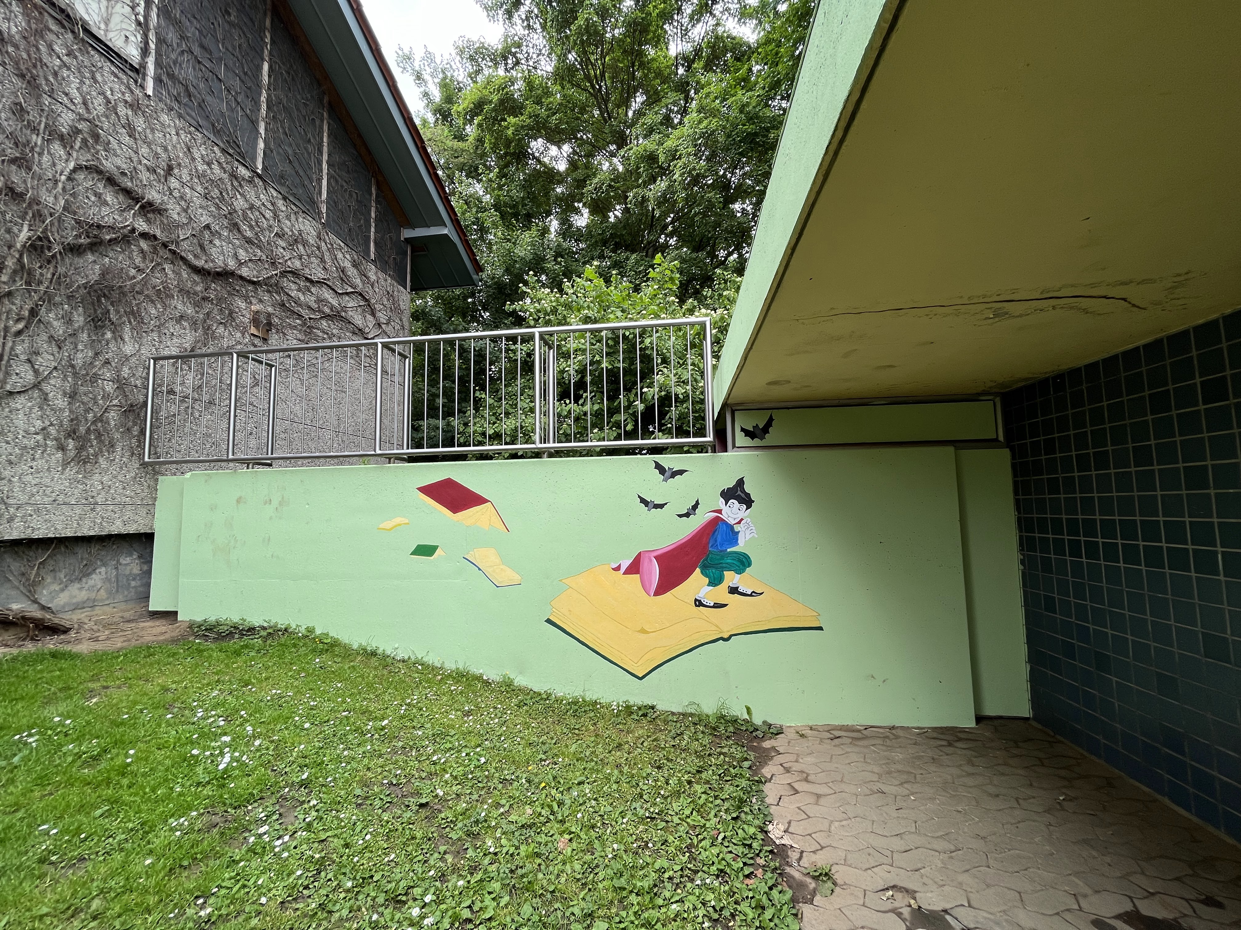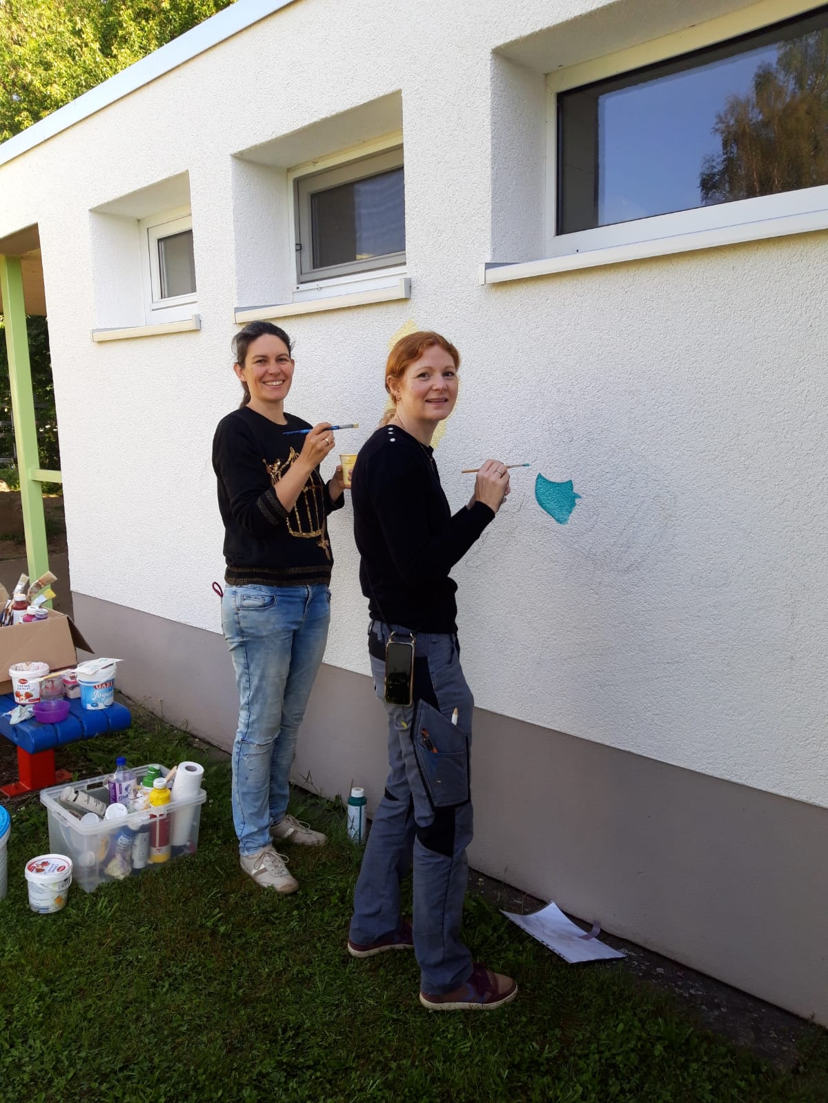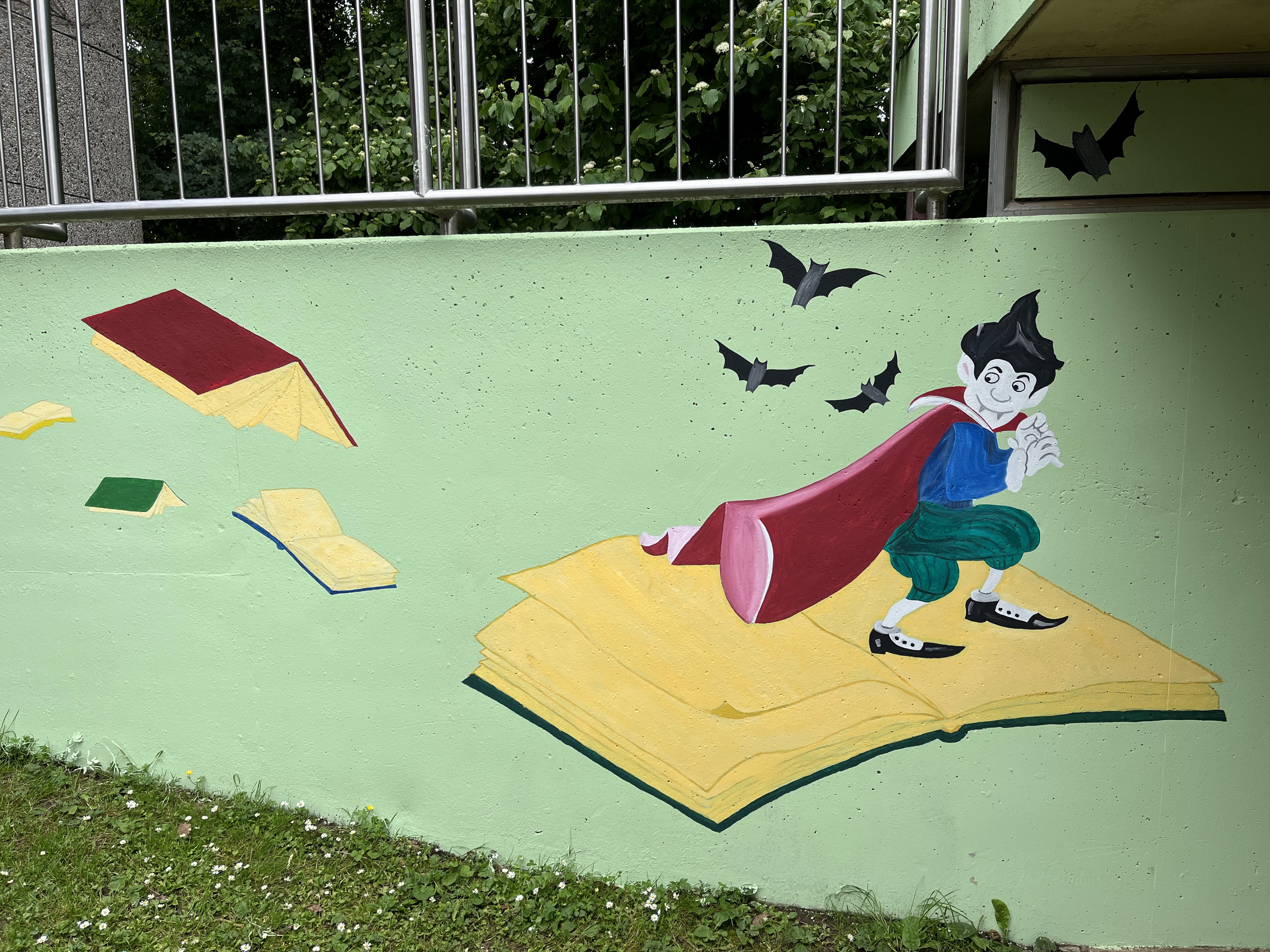 Durch die Künstlerinnen Frau Jacob und Frau Dietrich werden die Charaktere aus den Büchern von Gudrun Pausewang rund um unsere Schule lebendig. Schon jetzt sind Kinder und Kollegium von Spinatvampir und Co hellauf begeistert. Die Arbeit ist jedoch noch nicht abgeschlossen und wir können uns auf weitere Motive freuen!