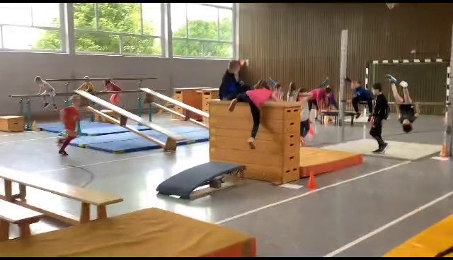 Die Schülerinnen und Schüler der Klassen 1 und 2 hatten dank des riesigen Angebots an Bewegungsmöglichkeiten in der Sporthalle viel zu entdecken und zu erproben: