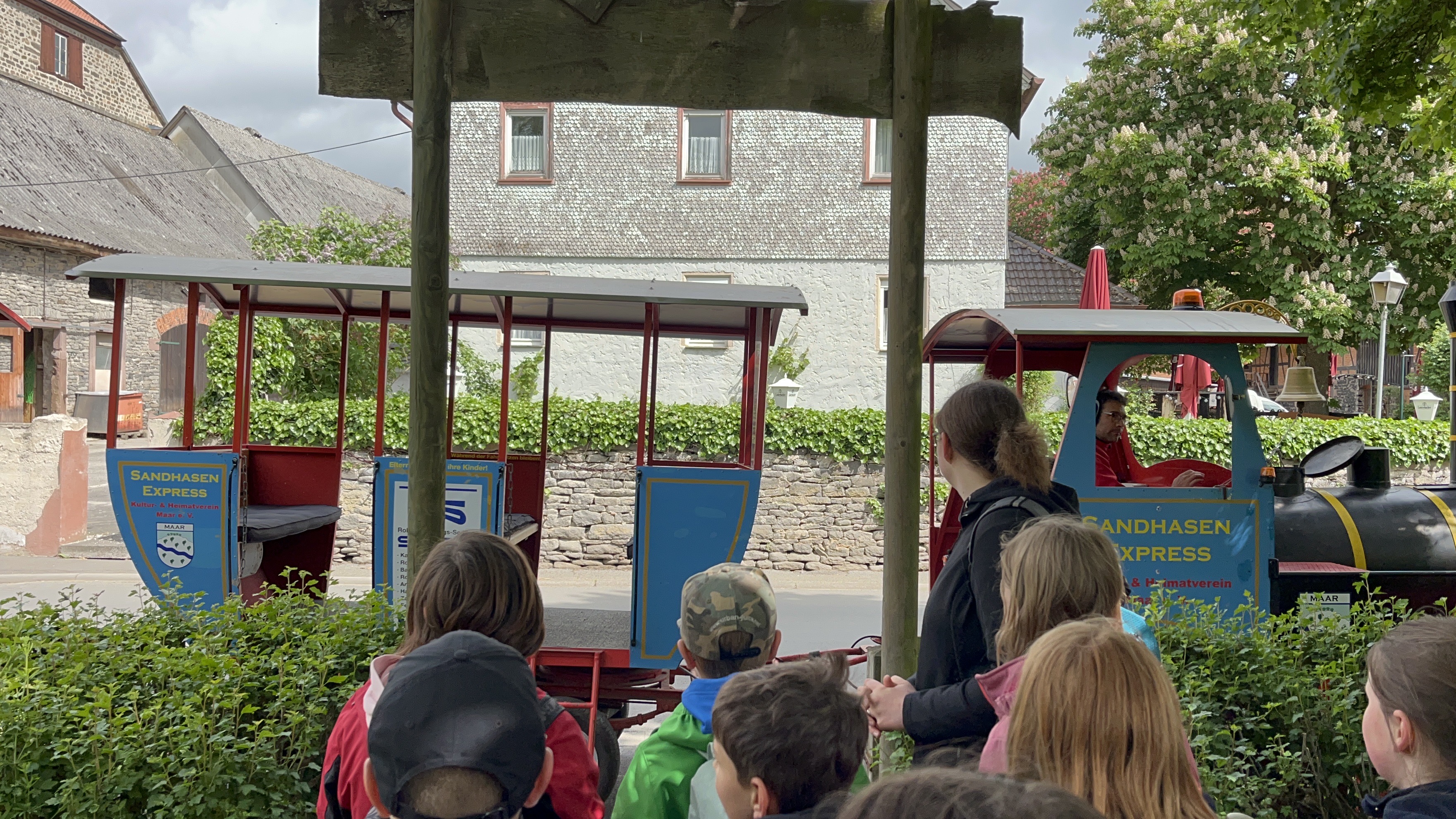 Das Ziel nach erfolgreicher Schatzsuche war dann der Spielplatz in Maar. Hier wurden auch sie vom Sandhasen-Express abgeholt und es wurde bei bester Laune und fetziger Musik eine Runde durch Maar gefahren, bevor es wieder zur Schule ging.