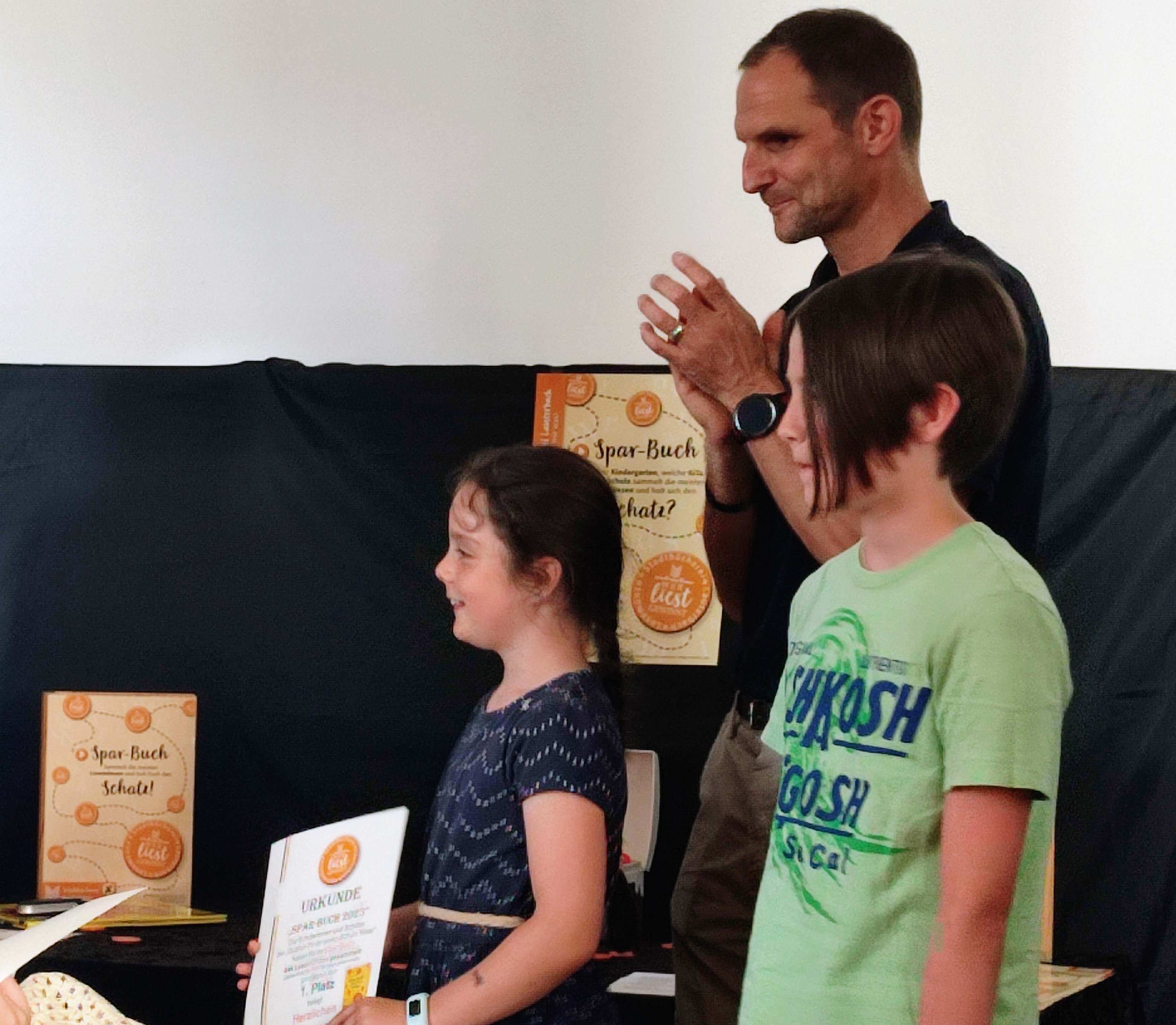 Danach wurde es spannend. Herr Marx verkündete zu Beginn die Gewinner unter den Kitas und danach bei den Grundschulen. Unsere Schülerinnen und Schüler haben in diesem Jahr die meisten Lesemünzen gesammelt und für die Schule den 1. Platz erreicht. Neben einer Urkunde und viel Applaus erhielten Jakob Merle und Alina Herber stellvertretend für die Schülerinnen und Schüler der Gudrun-Pausewang-Schule noch ein Airhockey-Spiel.