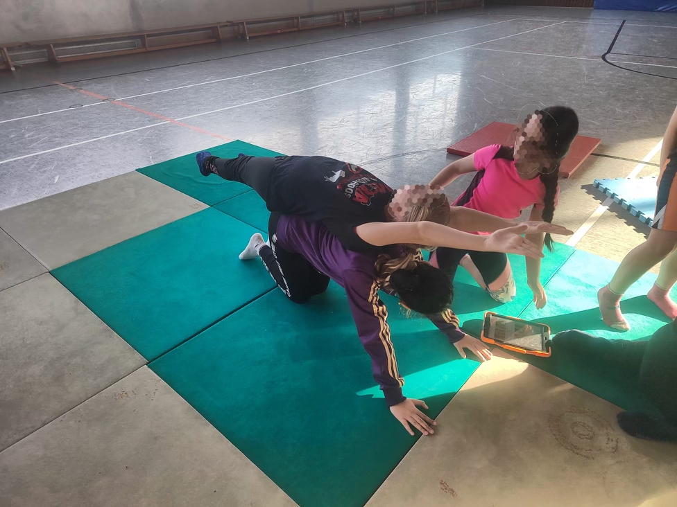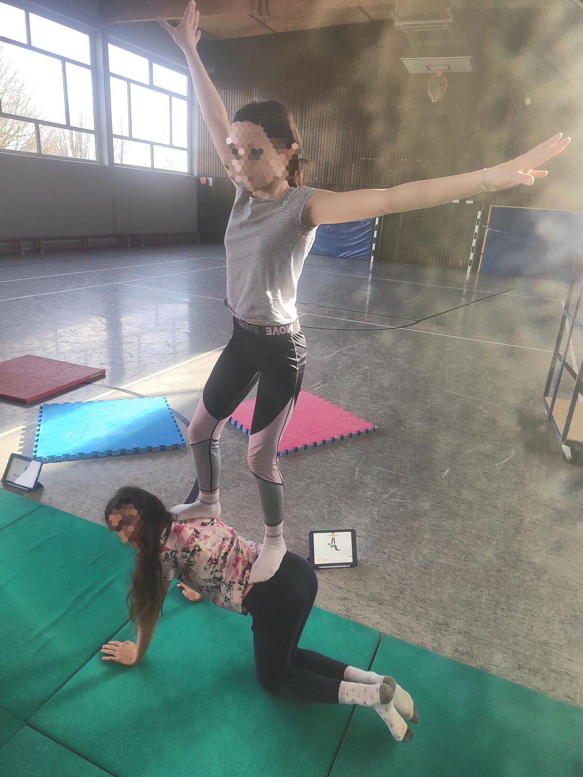 Bei der Partnerakrobatik arbeiteten die Schülerinnen und Schüler paarweise zusammen. Sie zeigten beeindruckende Hebungen, Handstände und menschliche Brücken. Die Freude und der Teamgeist waren deutlich spürbar!