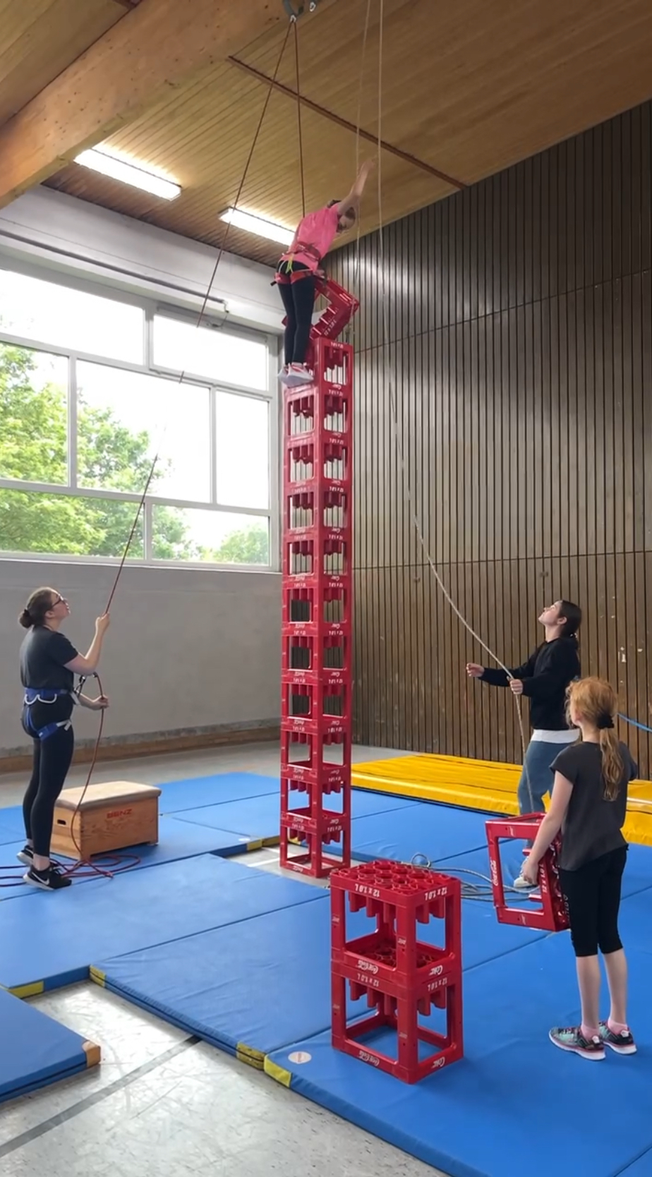 Auch dieses Mal haben Jutta Eurich und Markus Schweda die Turnhalle maximal ausgenutzt. Klettern, Schaukeln, Springen, Hüpfen, Hangeln und Balancieren war an vielen Stationen möglich und alle Kinder haben sich voller Vergnügen ausgetobt und viel Neues ausprobiert. Die ganz mutigen konnten sogar auf einen aus Getränkekisten selbst gebauten Turm klettern, der – entsprechendes Geschick und etwas Glück vorausgesetzt – bis zur Hallendecke reichen konnte! Dabei musste jedoch niemand Angst haben, denn sie wurden von Frau Waldschmidt fachgerecht abgesichert.