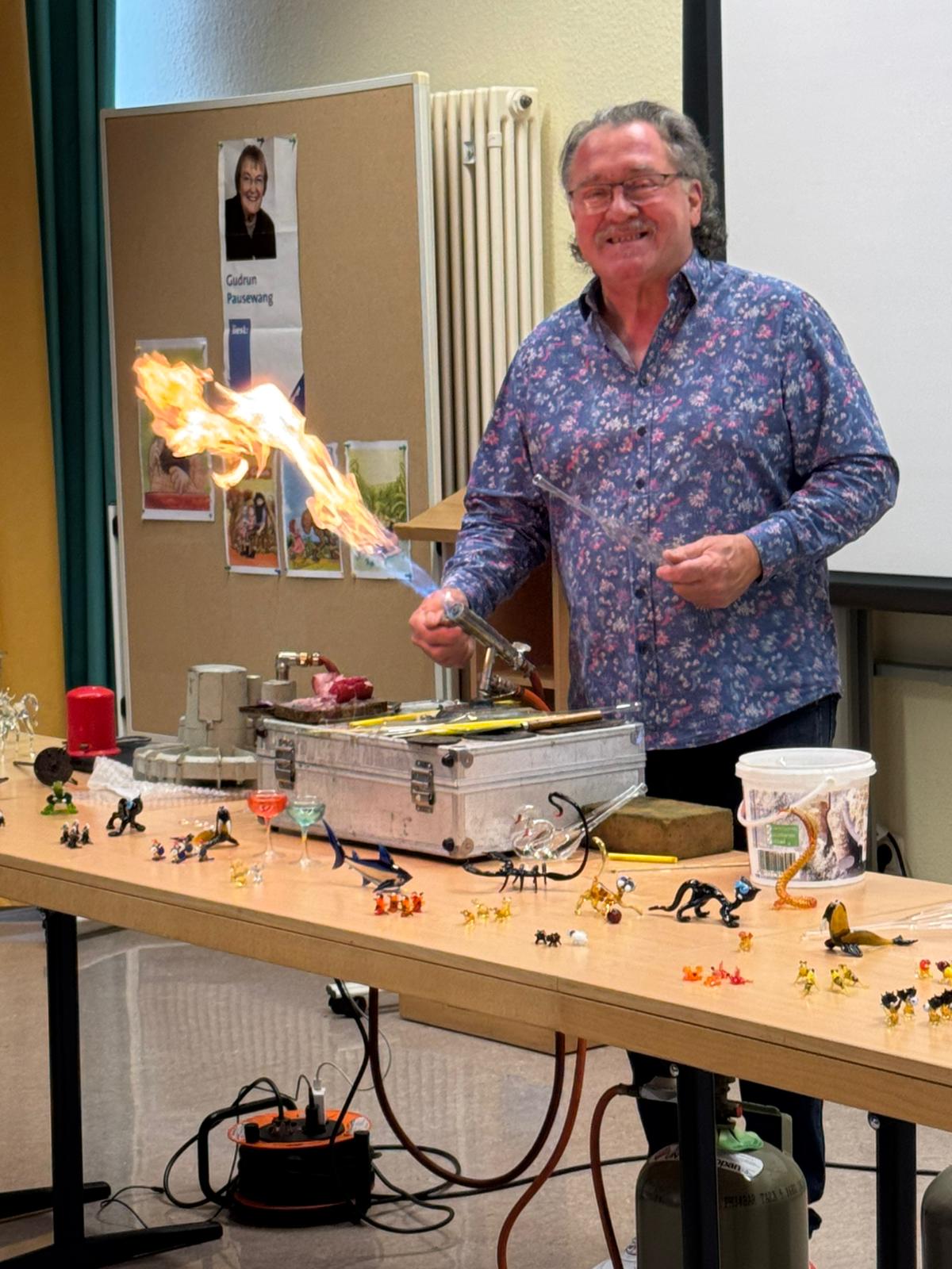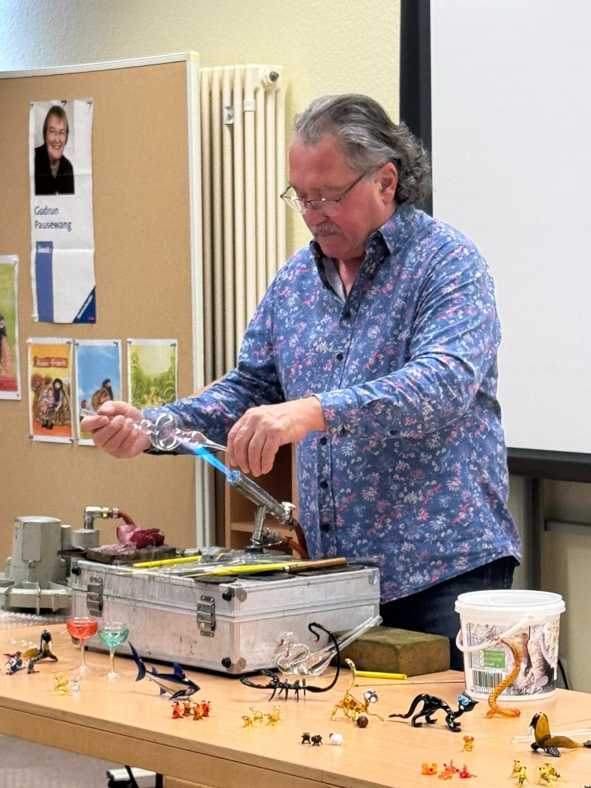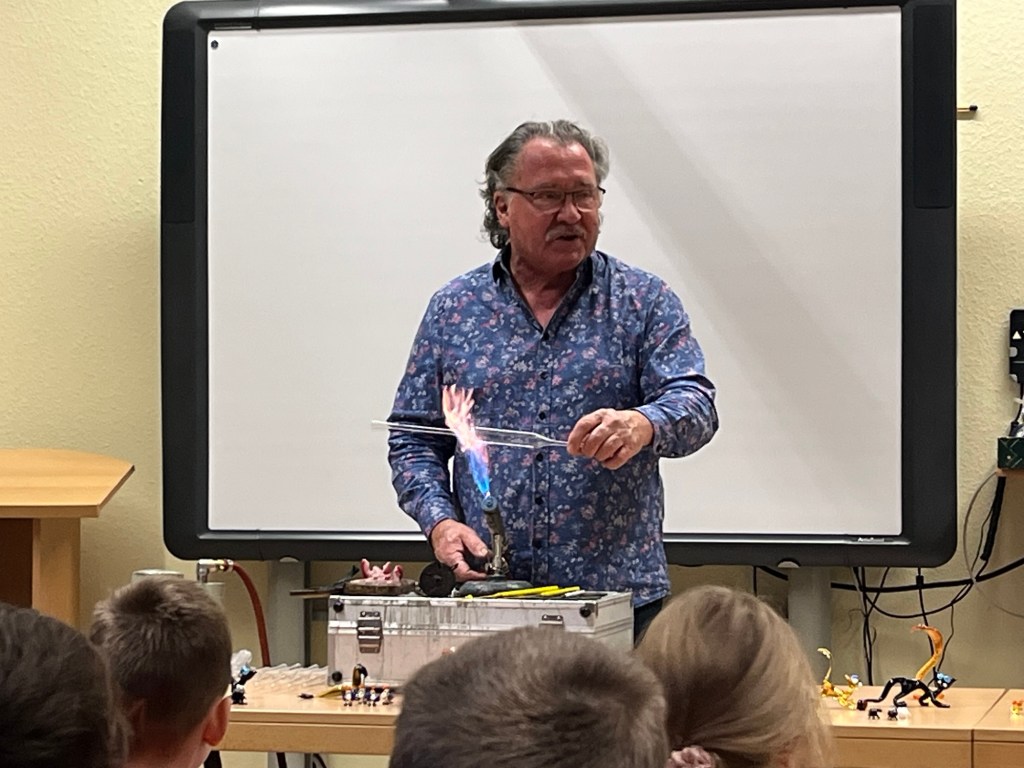 Am 27.11. war der Glasbläser, Helmut Sommer aus Coburg, nach vier Jahren wieder zu Gast, um uns die Arbeit seines beeindruckenden „heißen Berufs“ vorzuführen.