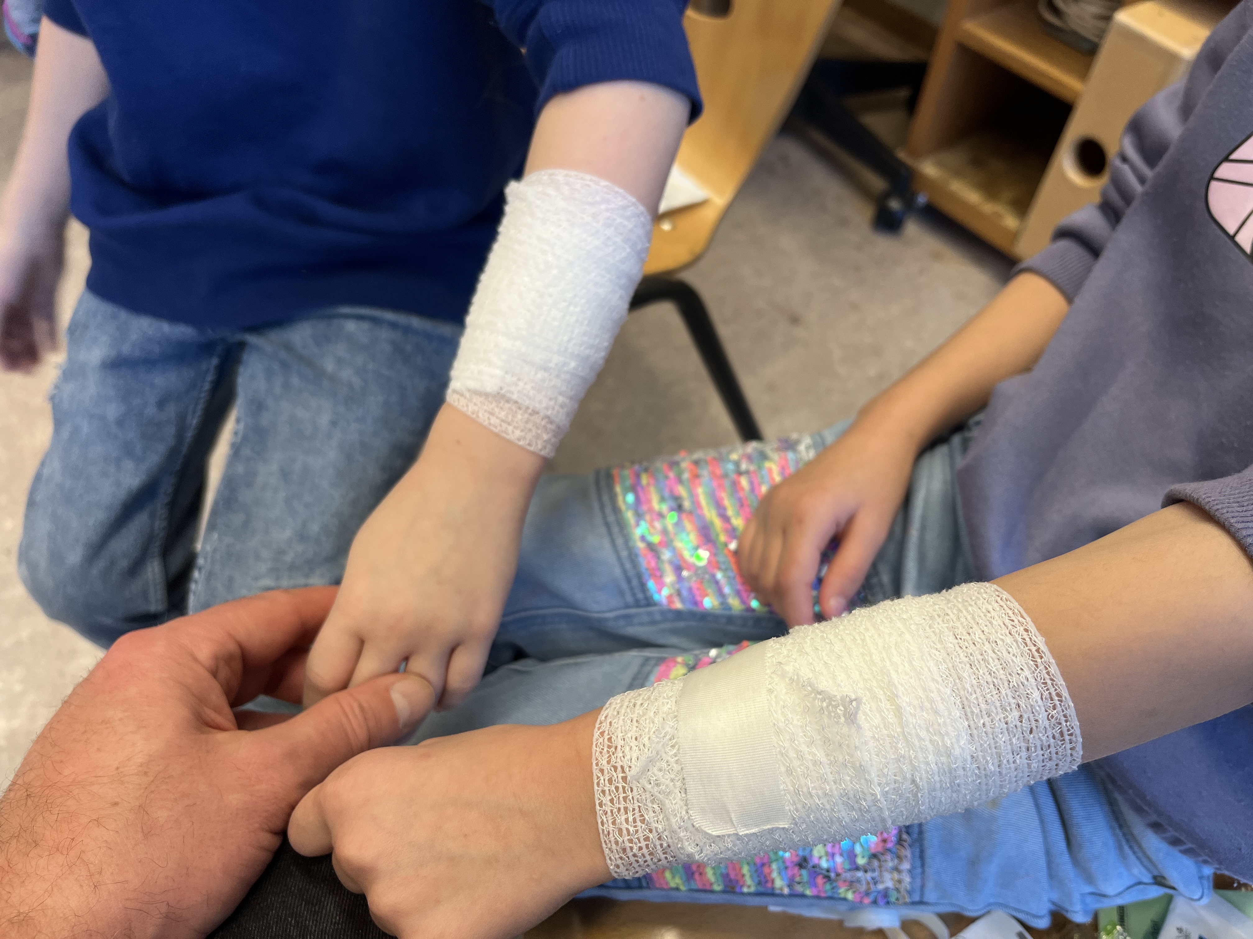 Zunächst lernten die Schülerinnen und Schüler, wie wichtig es ist, in Notsituationen Ruhe zu bewahren und Hilfe zu holen. Anschließend durften sie selbst aktiv werden: Die stabile Seitenlage wurde fleißig geübt, und das Anlegen von Verbänden war ein echtes Highlight. Die Kinder meisterten diese Herausforderung mit Bravour und wurden am Ende mit dem „Pflasterdiplom“ ausgezeichnet.