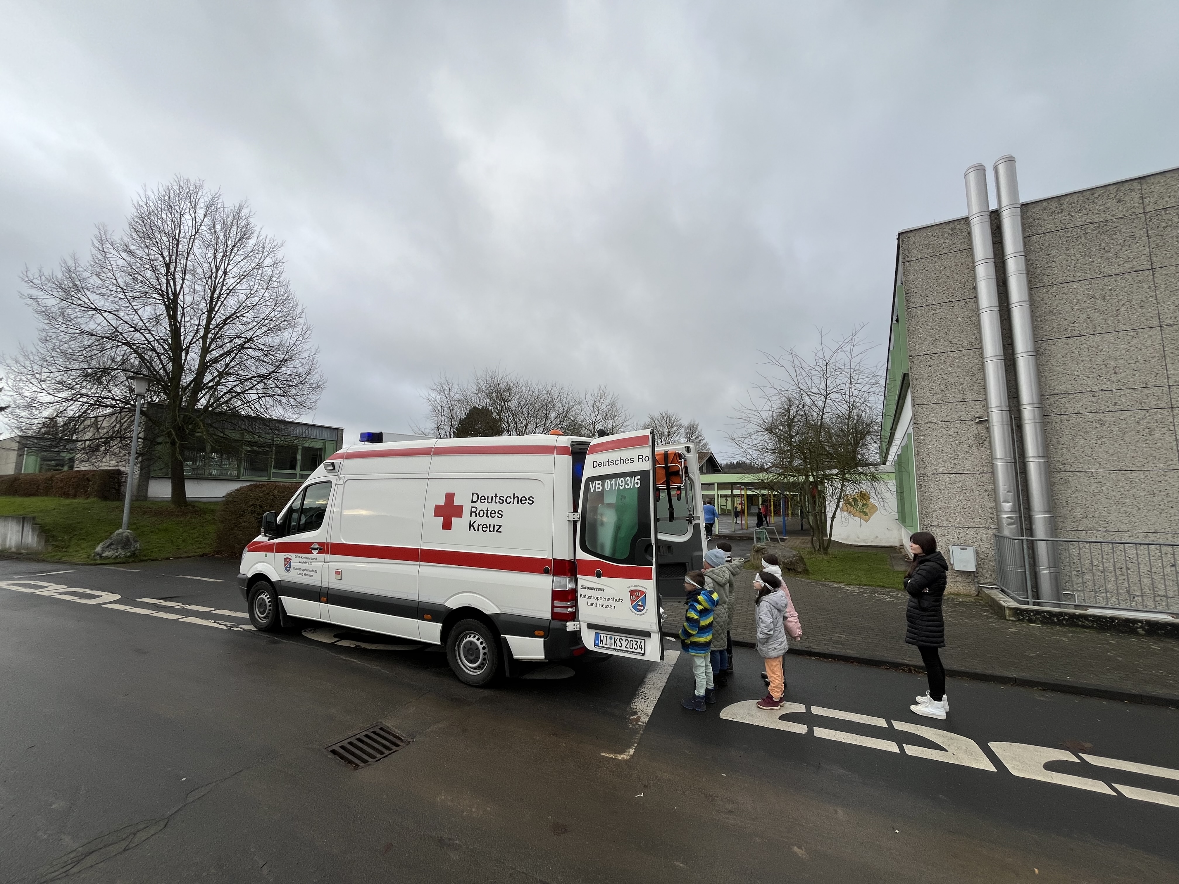 Zum Abschluss gab es noch eine spannende Überraschung: Der Krankentransportwagen wurde mit Blaulicht und Martinshorn auf den Schulhof gefahren. Die Kinder hatten die Möglichkeit, das Fahrzeug und seine medizinischen Einrichtungen von innen zu besichtigen. Die beeindruckende Lautstärke des Martinshorns sorgte für erstaunte Gesichter und war sicherlich ein unvergessliches Erlebnis.