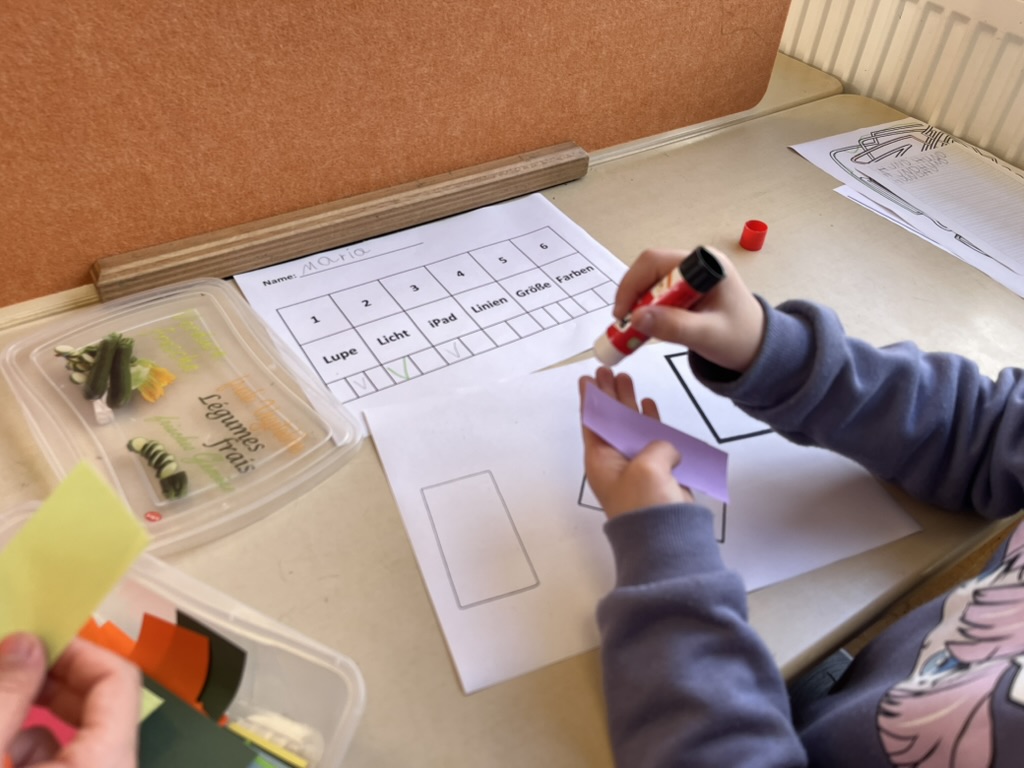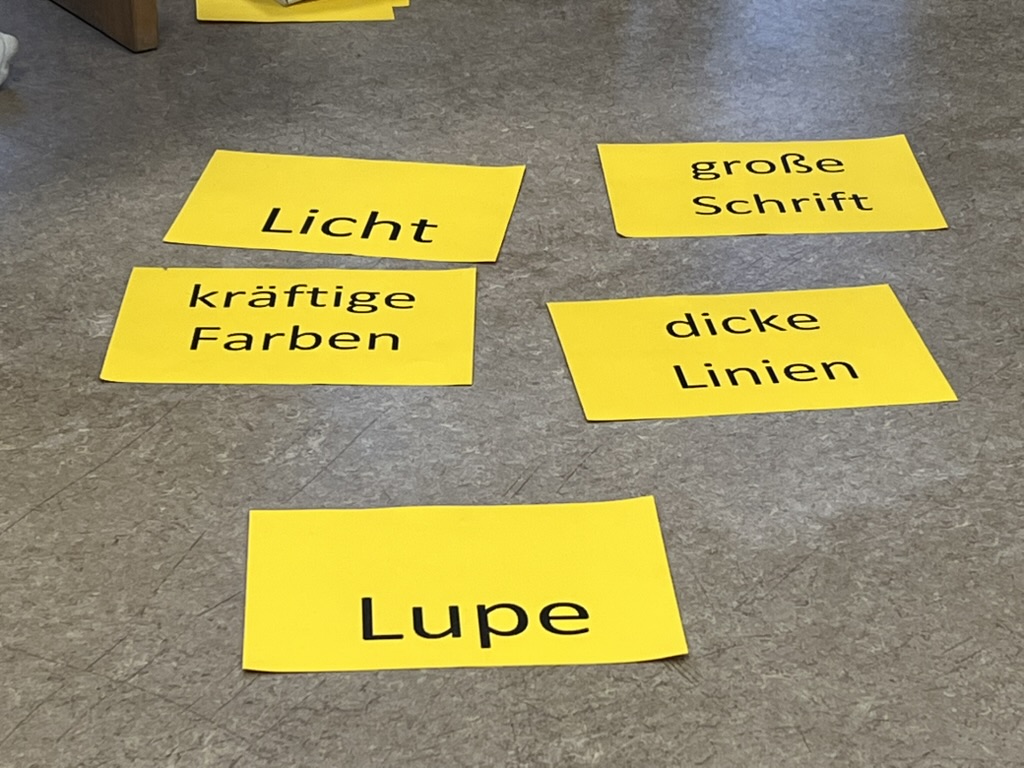 An sechs Stationen konnten die Kinder mit jeweils drei Übungen alltägliche Schulaufgaben wie Lesen, Schreiben, Einkleben oder das Nachspuren von Linien ausprobieren – jedoch unter den veränderten Sehbedingungen. Schnell wurde klar: Viele scheinbar einfache Aufgaben werden mit einer Sehbeeinträchtigung zur Herausforderung. Gleichzeitig erkannten die Kinder aber auch, was helfen kann, diese Aufgaben dennoch gut zu bewältigen: viel Licht, Vergrößerung, kontrastreiche Farben und eine klare Darstellung.