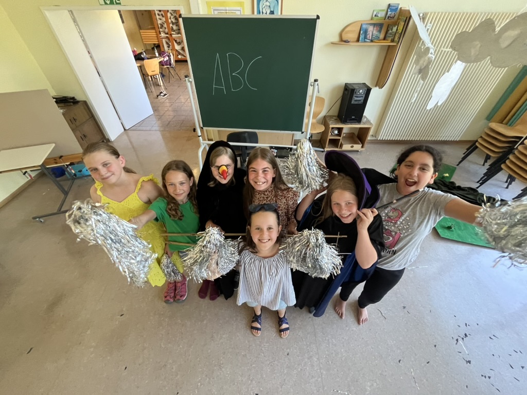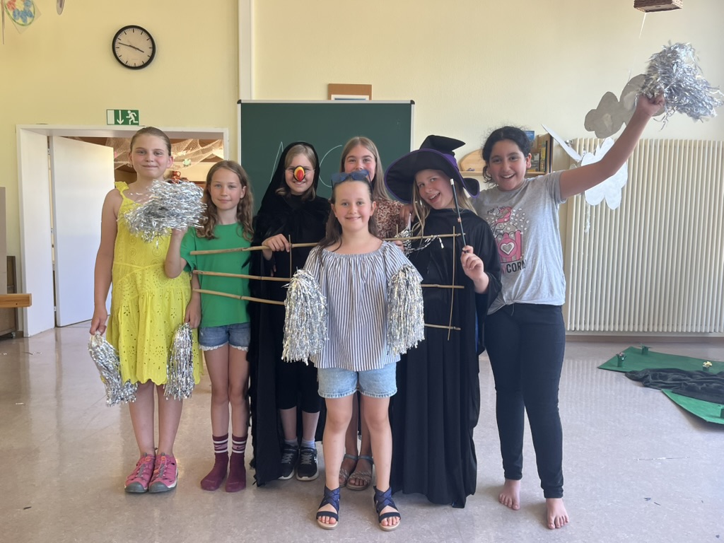 Neben ihrer Bühnenpräsenz hatten die Kinder auch bei der Gestaltung der Requisiten und Kostüme selbst Hand angelegt: Ein fantasievoller Bus, glitzernde Pompoms für die Tanzszenen, ein markanter Federumhang und eine überzeugende Zauberin sorgten für passende Akzente. Als einziger Bühnenhintergrund diente eine Tafel – ein einfaches, aber wirkungsvolles Element.