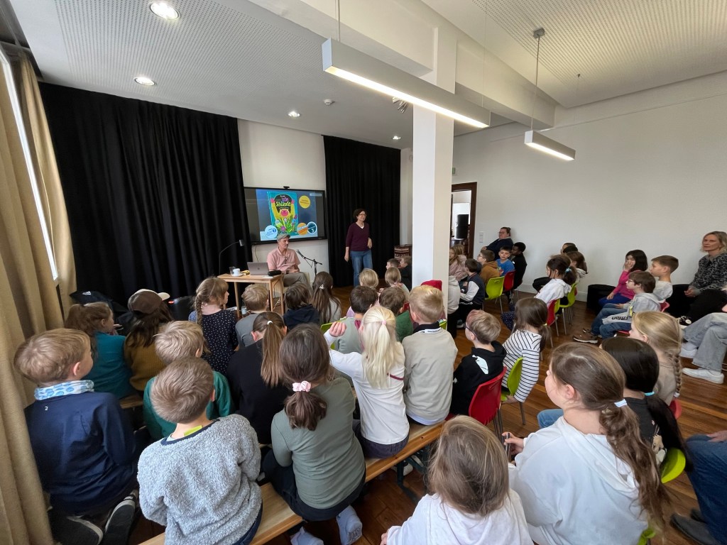 Wir durften uns dann aussuchen, was für einen Teil er vorliest. Zwischendurch gab es immer mal ein Quiz mit Fragen zu Monstern und viele Bilder zum Buch. Wir hatten viel Spaß beim Zuhören und Mitmachen! Nach der Lesung konnte man das Buch kaufen und signieren lassen. Zusätzlich gab es als Geschenk für jedes Kind ein Lesezeichen.