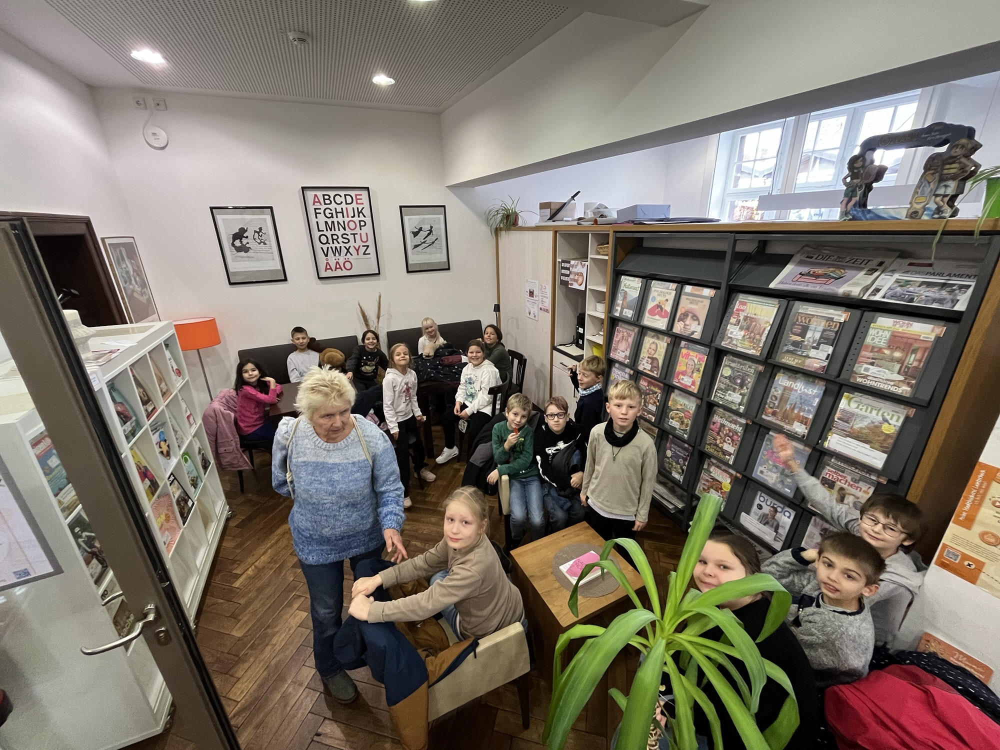 Mit dem Bus ging es nach der ersten Pause los nach Lauterbach. Dort mussten wir noch einen Augenblick warten, bis wir zusammen mit zwei dritten Klassen aus Angersbach gaaaaaanz hoch in den zweiten Stock durften, wo Herr Mohl schon auf uns wartete. Frau Petra Scheuer von der Bücherei begrüßte uns – und dann ging es auch schon los.